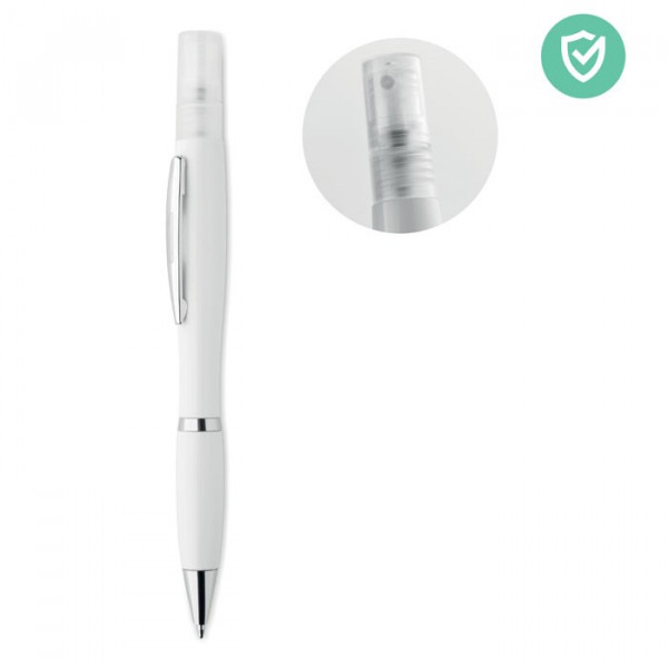 ABS balpen met antibacteriële coating en drukknop. In de top van de pen zit een kleine, lege navulbare spray (4ML) om zelf te vullen met desinfectiespray. ISO 22196. Blauwe inkt.