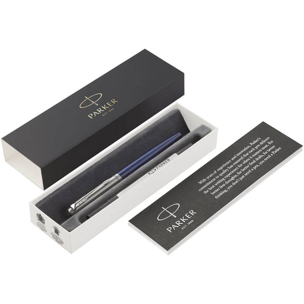 De Jotter rollerbalpen is een moderne interpretatie van de originele icoon. Met de iconische gekleurde huls, de gepolijste roestvrijstalen dop en de pijlklem. Geleverd in een Parker geschenkverpakking.
