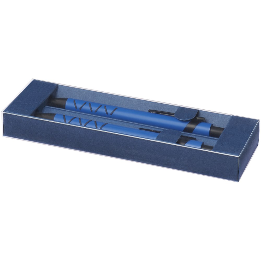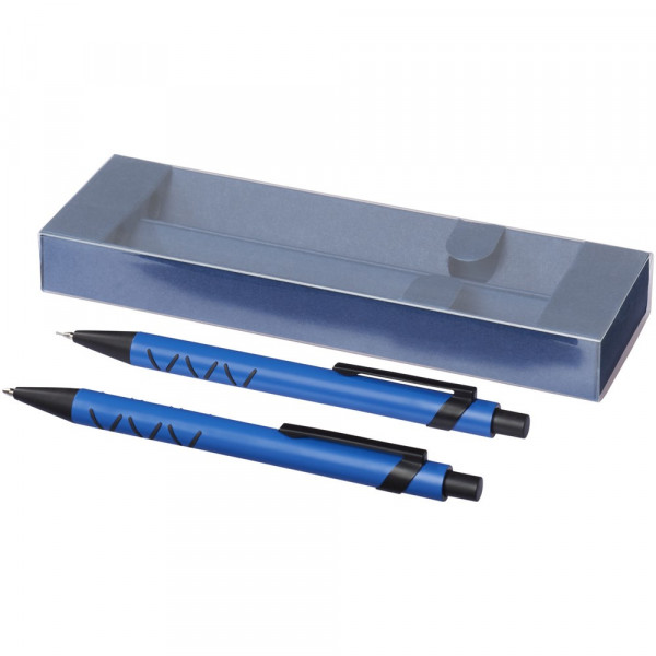 Balpen en mechanisch potlood met klikmechanisme in een bijpassende papieren geschenkverpakking. Zwartschrijvend.
