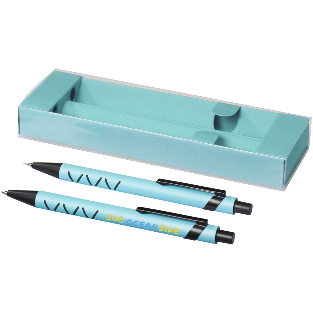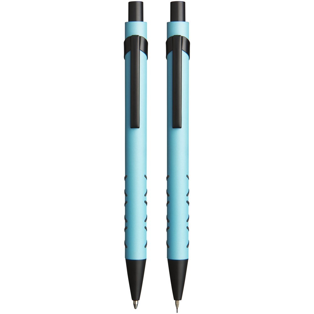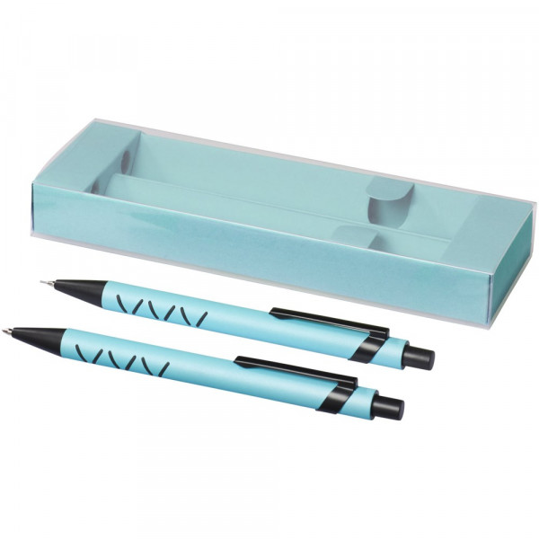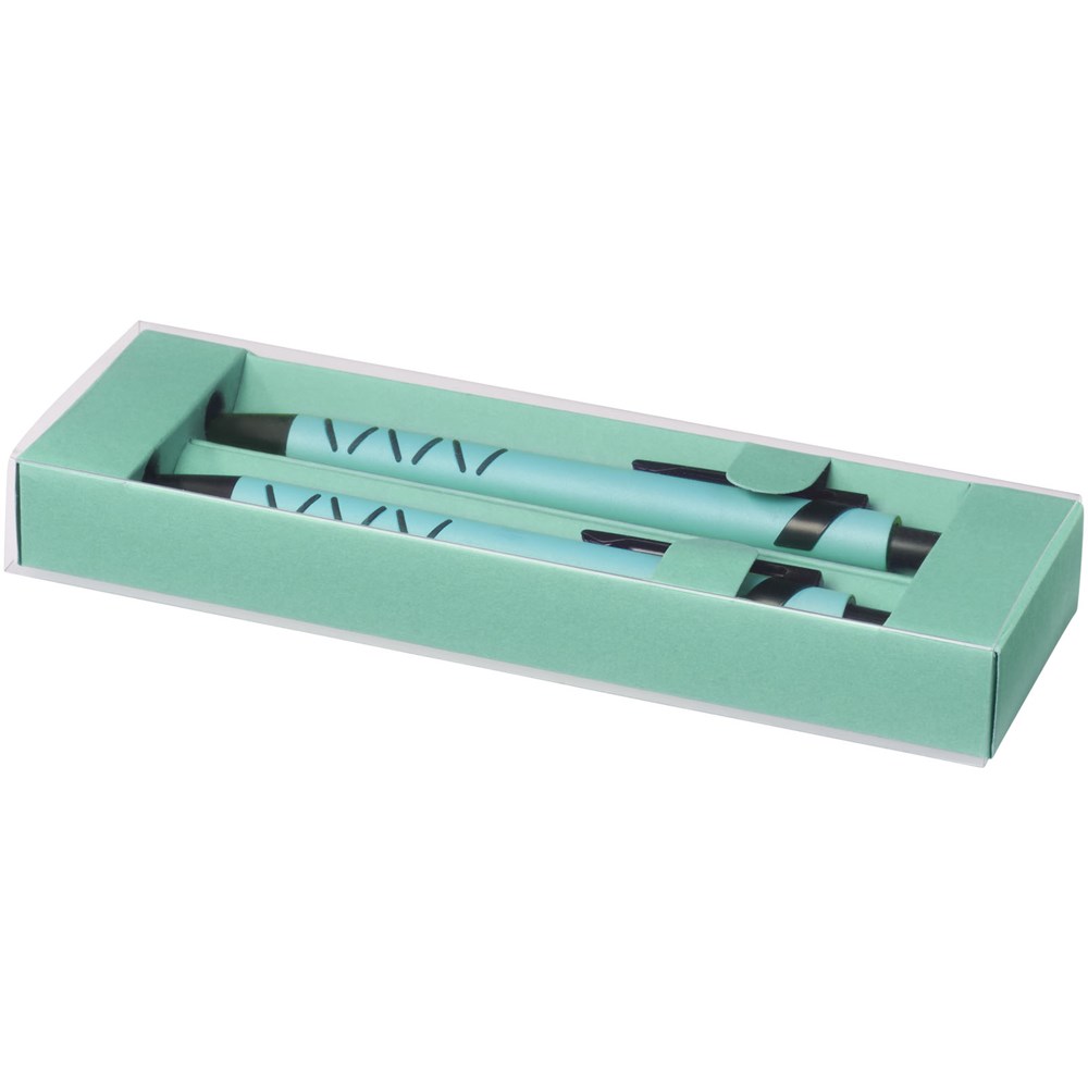 Balpen en mechanisch potlood met klikmechanisme in een bijpassende papieren geschenkverpakking....meer