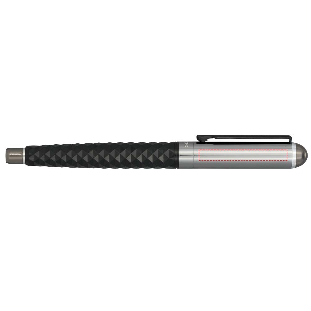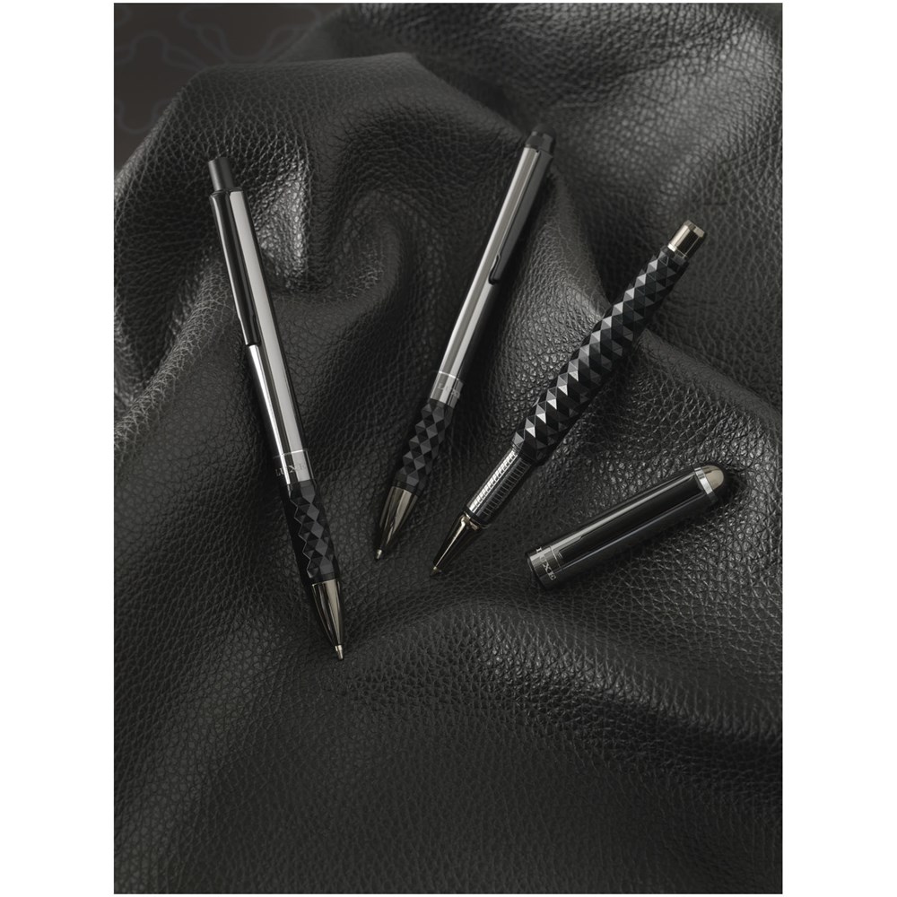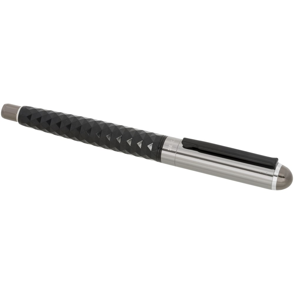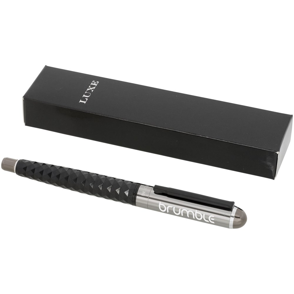Slank en elegant, stevig in de hand. Deze exclusief ontworpen rollerball heeft klasse en karakter. De schacht is voorzien van een anti-slip greep. Inclusief premium navulling (zwart) en geleverd in ''LUXE'' geschenkverpakking (17 x 3,5 x 2 cm).