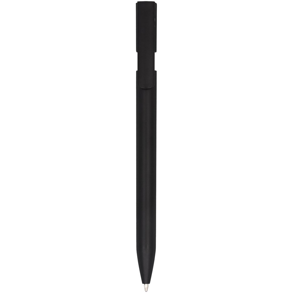Zwarte pen met gekleurde details. Heeft een klikmechanisme. Blauwschrijvend.