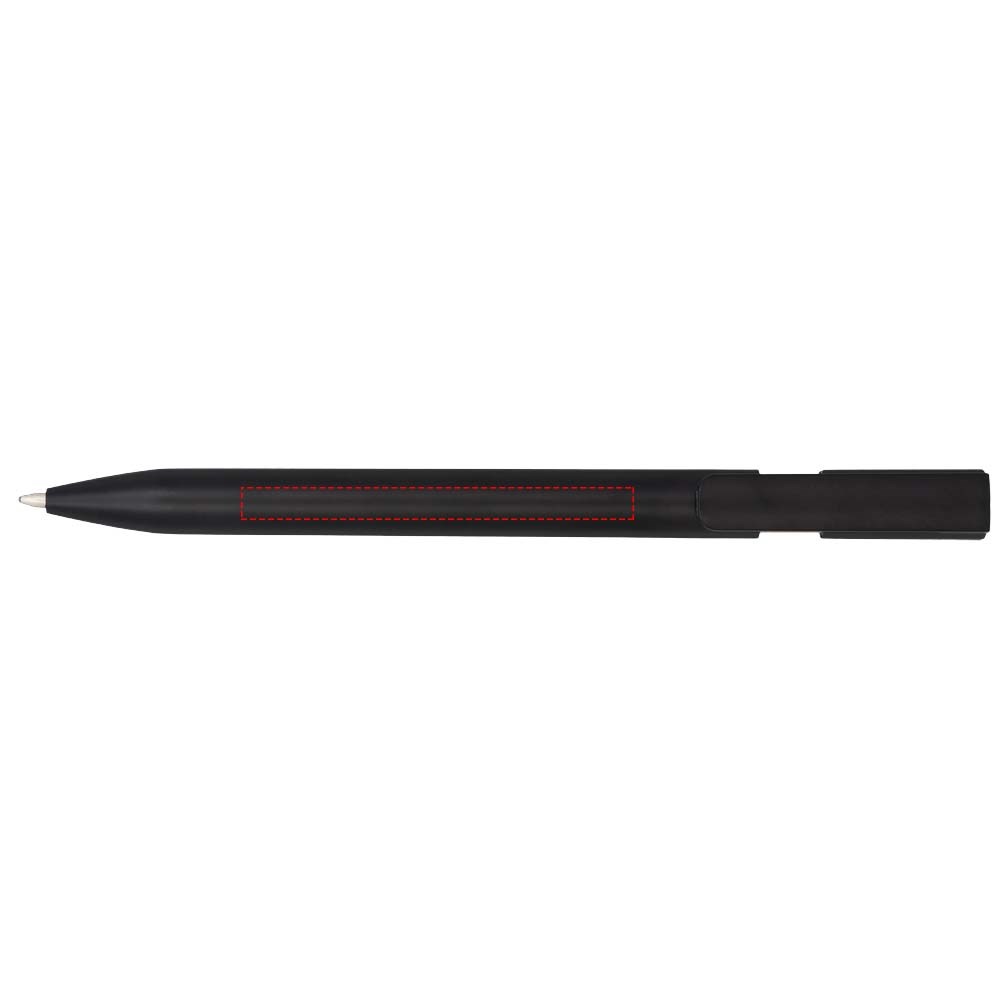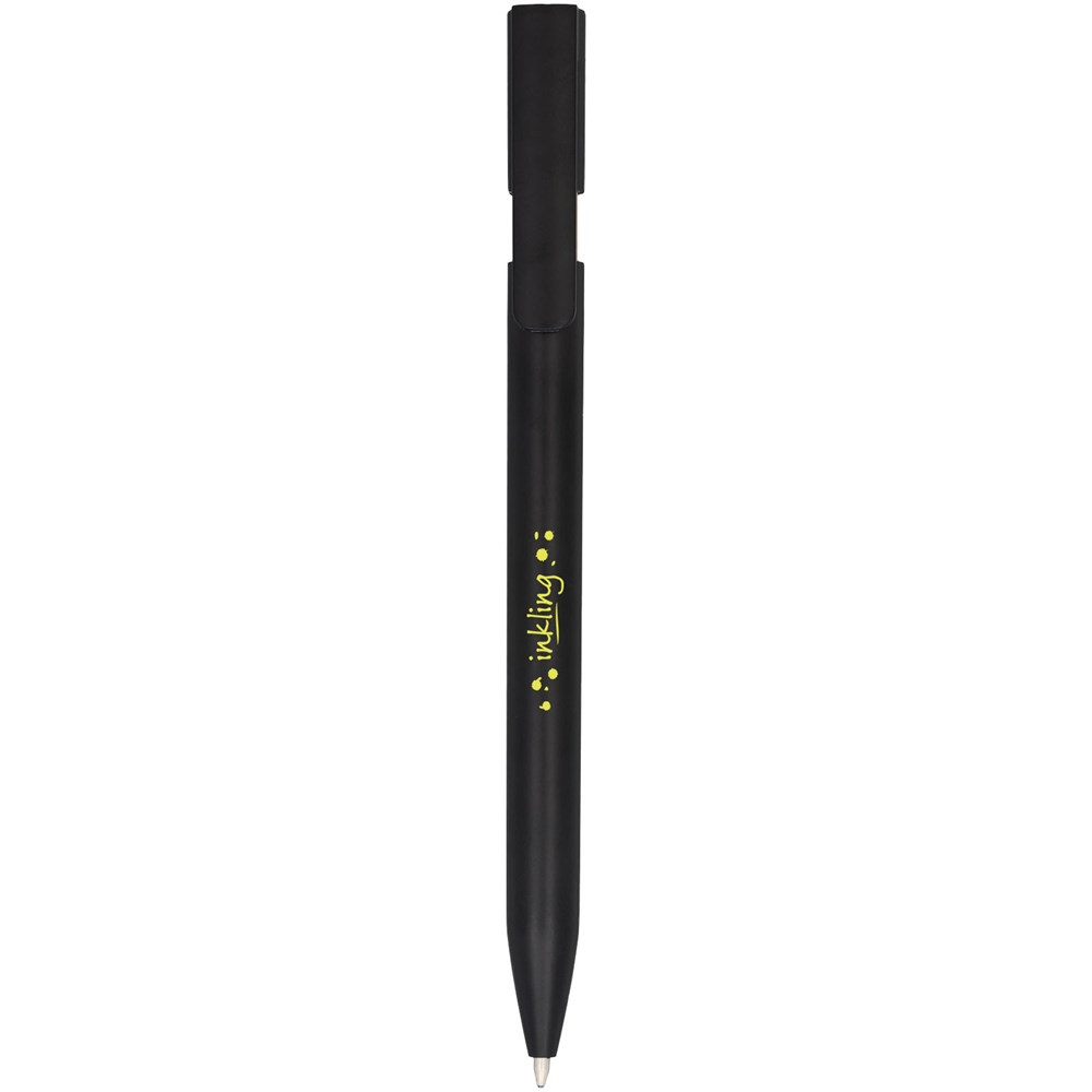 Zwarte pen met gekleurde details. Heeft een klikmechanisme. Blauwschrijvend.