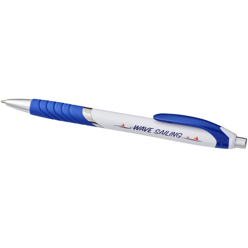 Populaire balpen met klikmechanisme en witte huls, gekleurde clip, rubberen grip en extra zilveren accenten.
