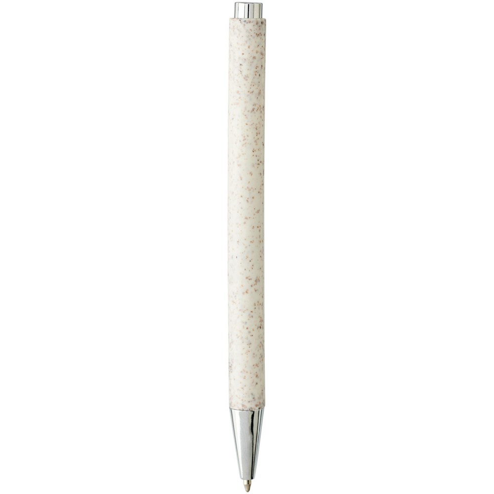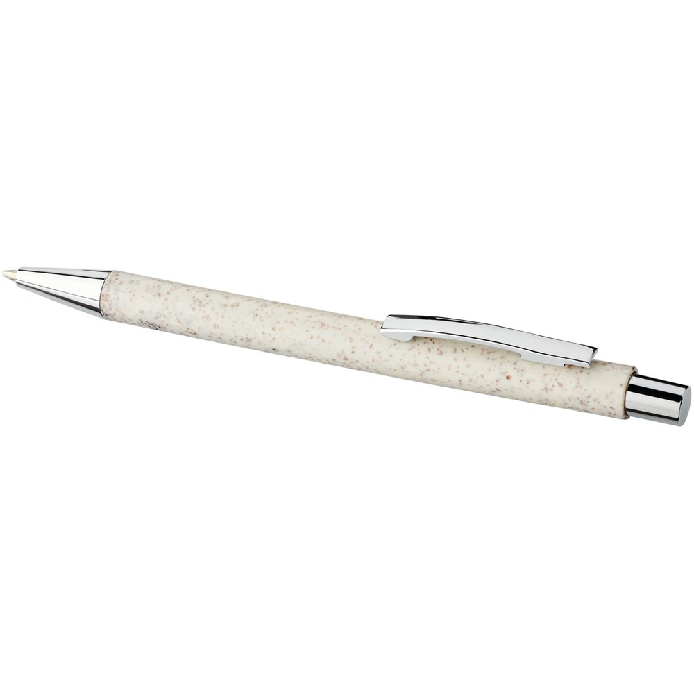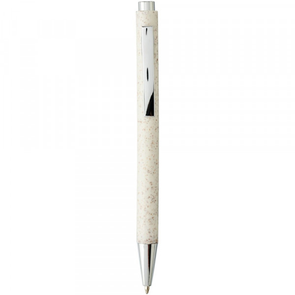 Elegante klassieke balpen met klikmechanisme, met een huls van tarwestro en afgewerkt met opvallende chroomkleurige details. Na het oogsten van de tarwekorrels blijft er tarwestro over, waardoor er minder plastic wordt gebruikt.