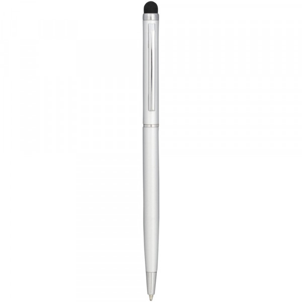 Slank vormgegeven balpen van aluminiumglazuur. Met draaimechanisme en stylus.