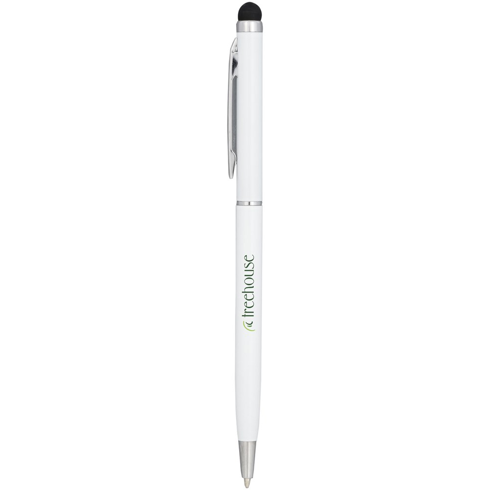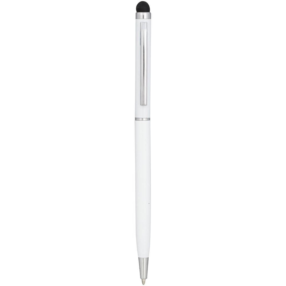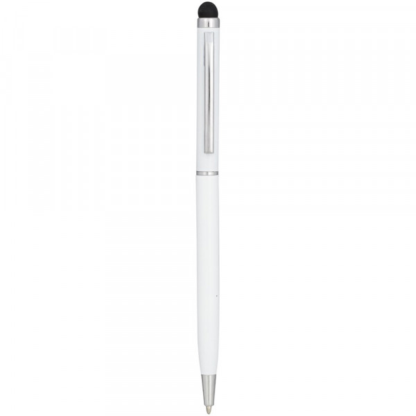 Slank vormgegeven balpen van aluminiumglazuur. Met draaimechanisme en stylus.