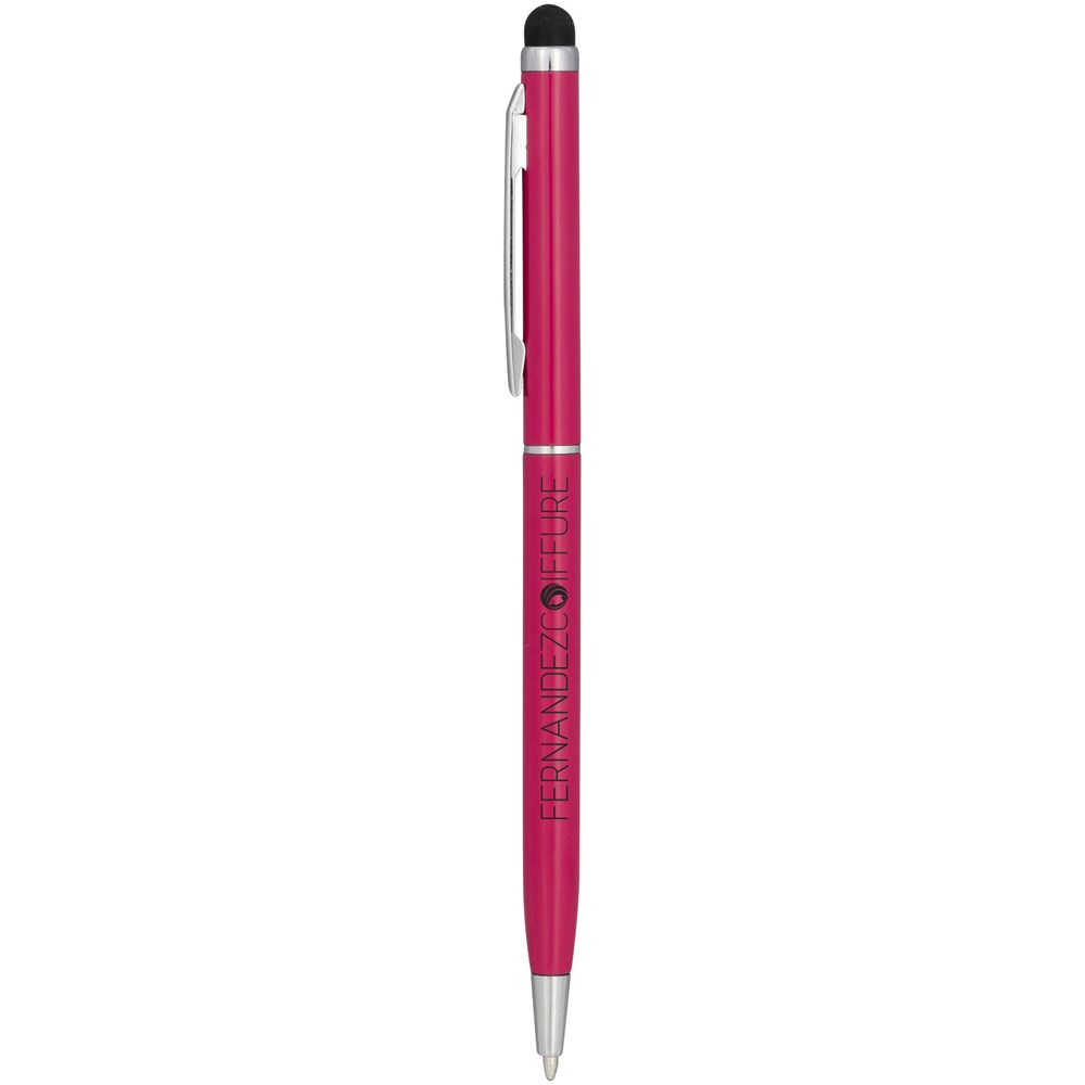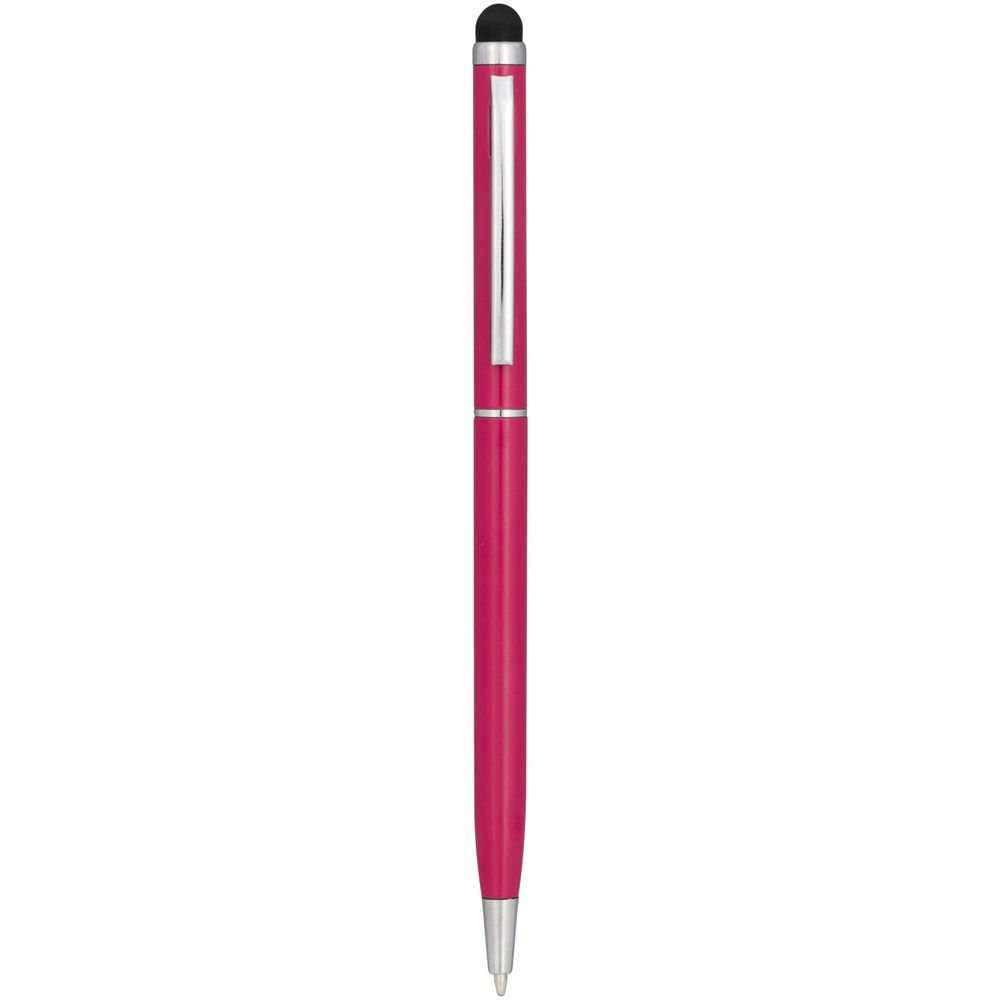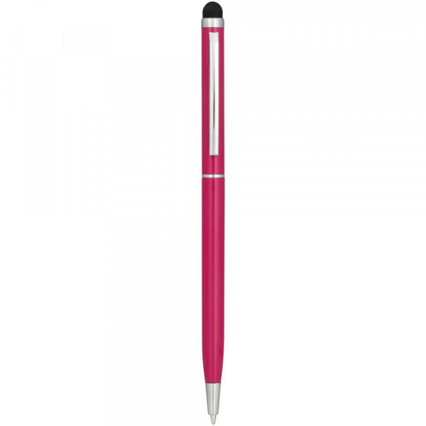 Slank vormgegeven balpen van aluminiumglazuur. Met draaimechanisme en stylus.