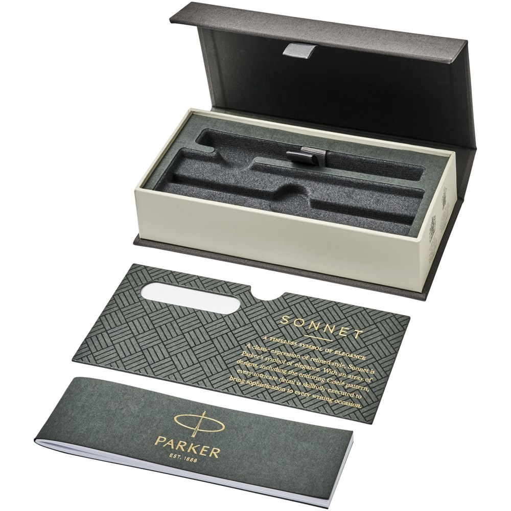 Een klassieke uitdrukking van verfijnde stijl, Sonnet is het symbool van Parker voor elegantie. Met een scala aan ontwerpen, inclusief het blijvende Ciselé-patroon, wordt elk ingewikkeld detail uitvoerig uitgevoerd om verfijning te brengen voor elke schriftelijke gelegenheid. Geleverd met gepatenteerde QuinkFlow vulling in een Parker geschenkverpakking. Exclusief ontwerp. Zwartschrijvend.