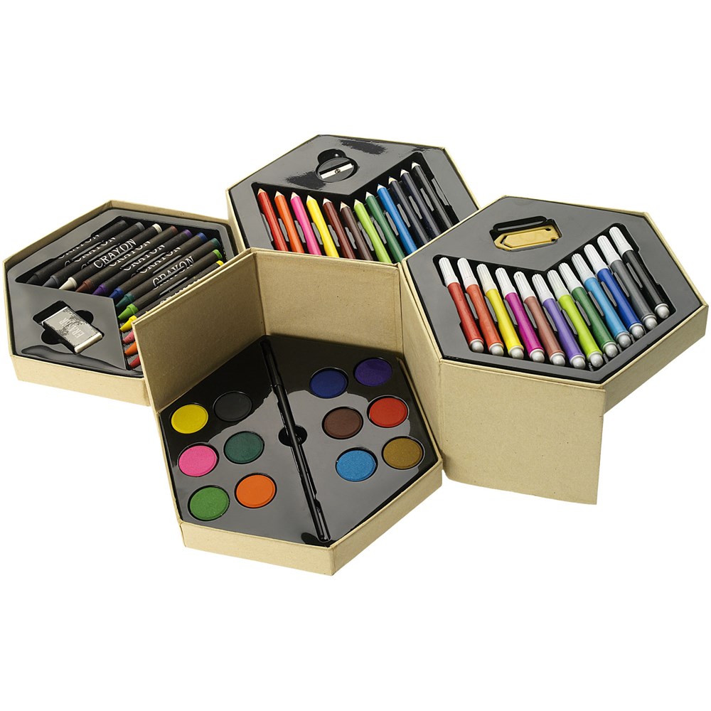 Set van 12 markers, 12 kleurpotloden, 12 waskrijtjes, 12 kleuren waterverf, penseel, puntenslijper, gum en een grote paperclip. Decoratie is niet mogelijk op de losse onderdelen.