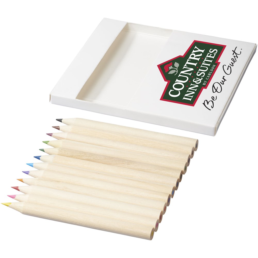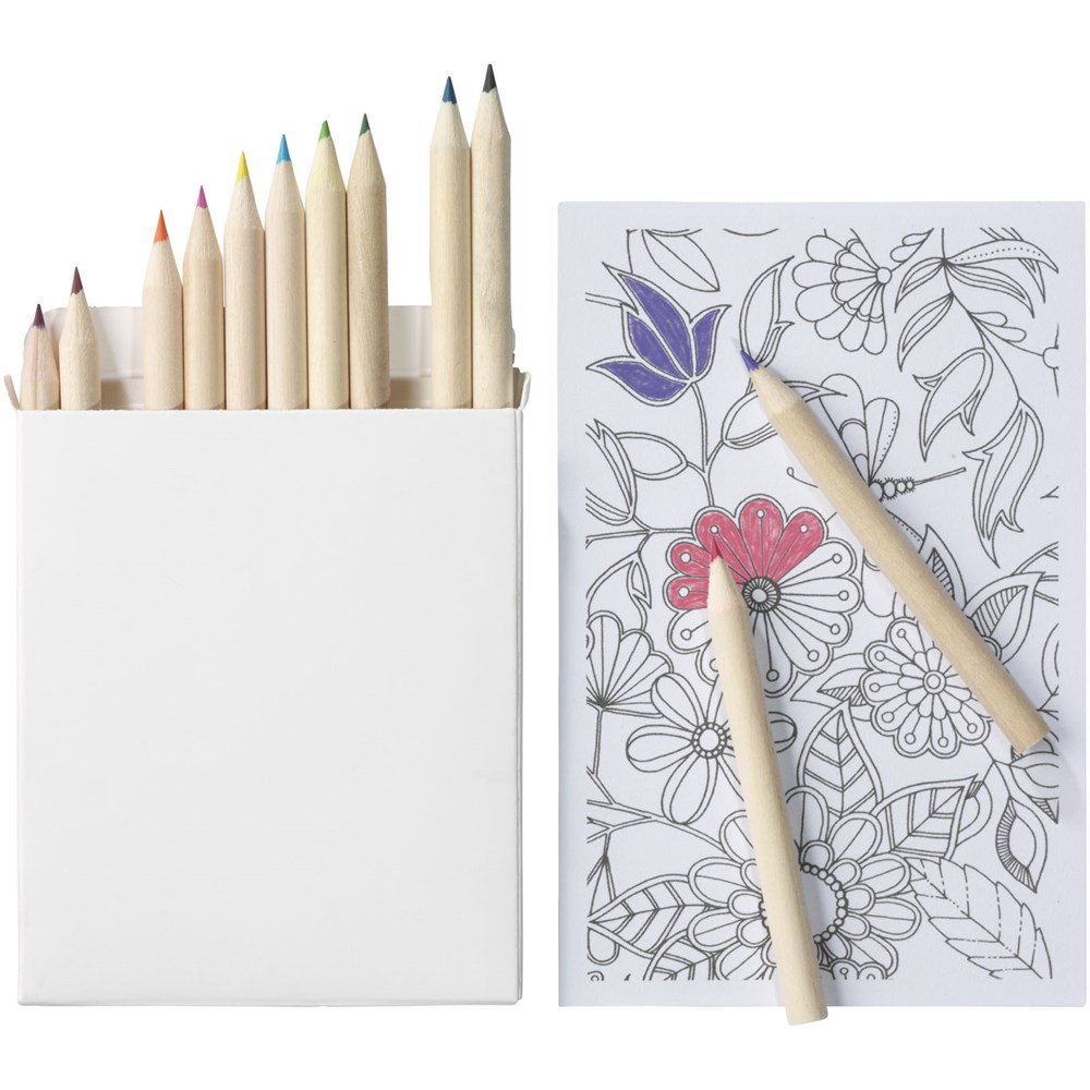 12 kleurpotloden en 10 doodle kaarten. Decoratie kan niet worden geplaatst op de losse onderdelen.