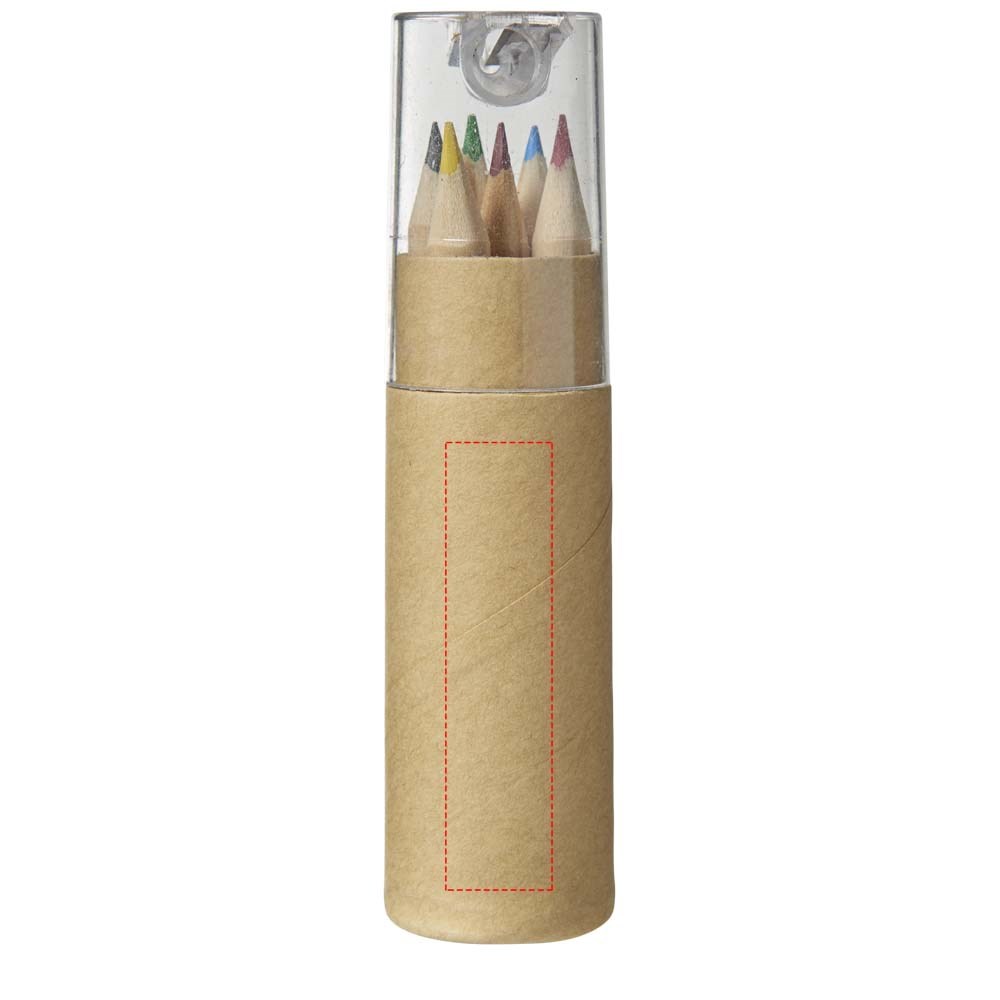 Set van 6 kleurpotloden in een kartonnen koker met kunststof deksel en puntenslijper. Decoratie is niet mogelijk op de inhoud.