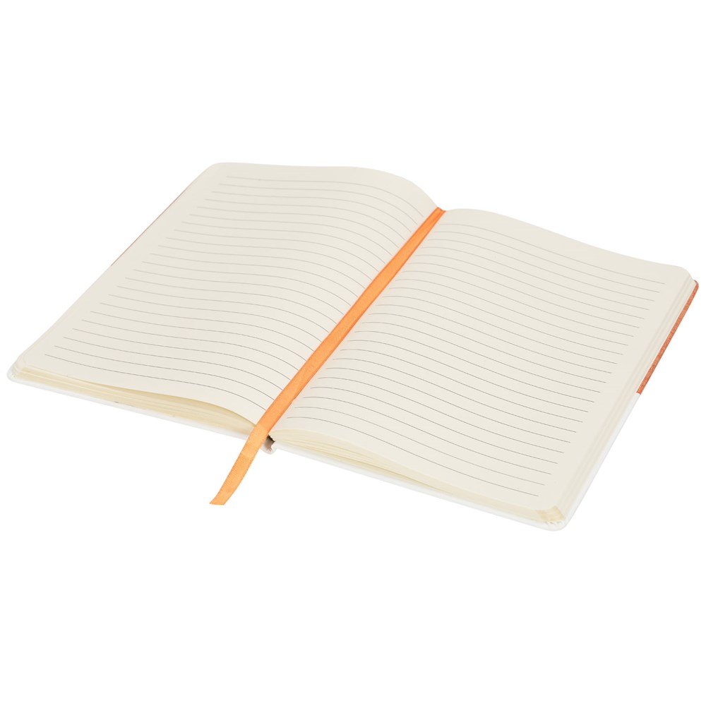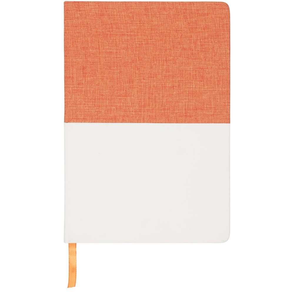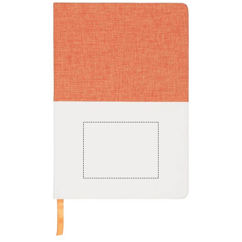 Two-tone canvas A5 notitieboek. A5 notitieblok met gekleurde canvas omslag en bijpassend lint. Omvat 80 bladen (70g/m2) gelinieerd papier. PVC en canvas.