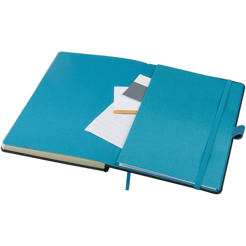 Hardcover A5 formaat notitieboekje voor de creatieve professional voor het maken van notities of het maken van schetsen. De verschillende kleurige papier met bijpassende gekleurde elastieke sluiting en lintmarkering geven het notitieboek een extra frisse uitstraling. Overige kenmerken zijn onder meer 40 pagina's van 80 gram gelinieerd papier en 40 pagina's van 80 gram blanco papier. Een opbergvak om losse notities en papieren bij elkaar te houden. Verpakt in een witte geschenketui.