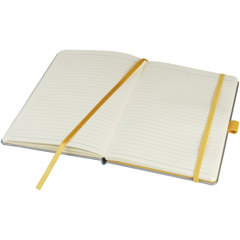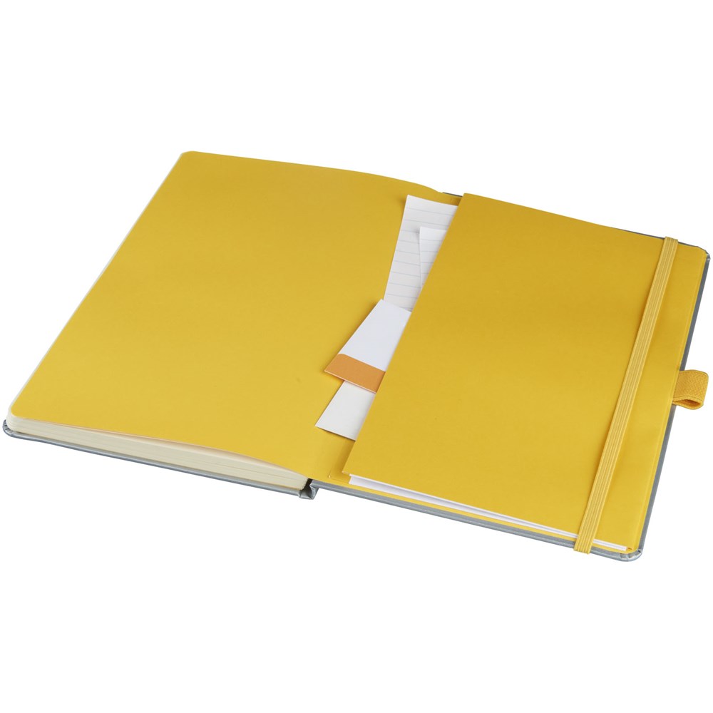 Hardcover A5 formaat notitieboekje voor de creatieve professional voor het maken van notities of het maken van schetsen. De verschillende kleurige papier met bijpassende gekleurde elastieke sluiting en lintmarkering geven het notitieboek een extra frisse uitstraling. Overige kenmerken zijn onder meer 40 pagina's van 80 gram gelinieerd papier en 40 pagina's van 80 gram blanco papier. Een opbergvak om losse notities en papieren bij elkaar te houden. Verpakt in een witte geschenketui.