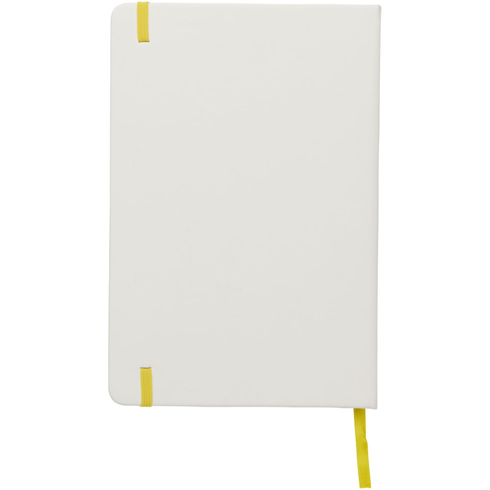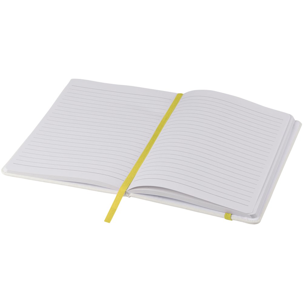 Witte A5 notitieboek met gekleurde elastische sluiting en lint. Inclusief 80 vellen (60 g / m2) gelinieerd papier. Digitaal printen mogelijk op omslag.
