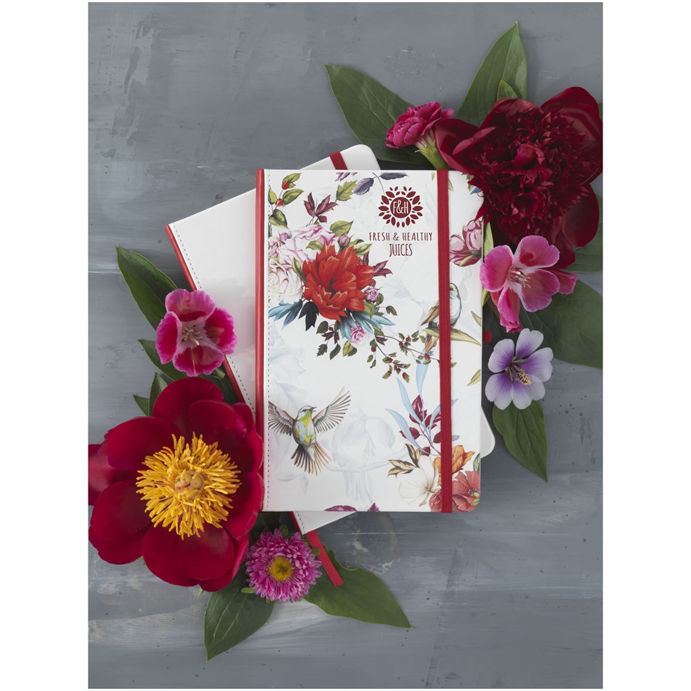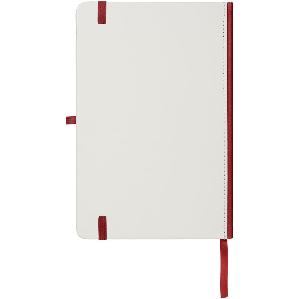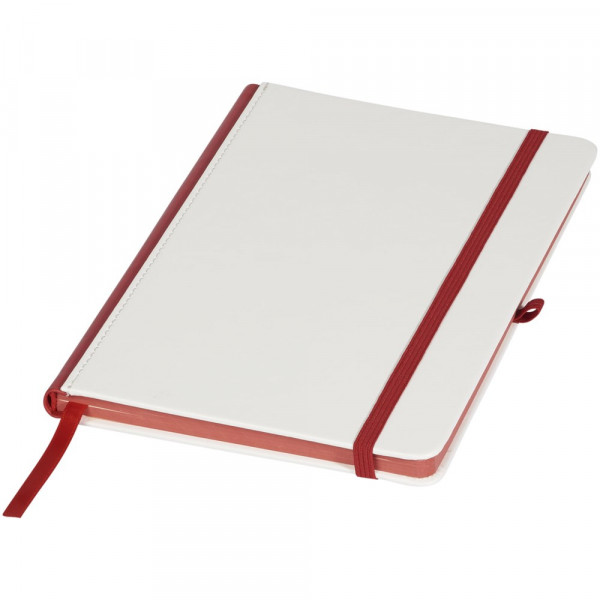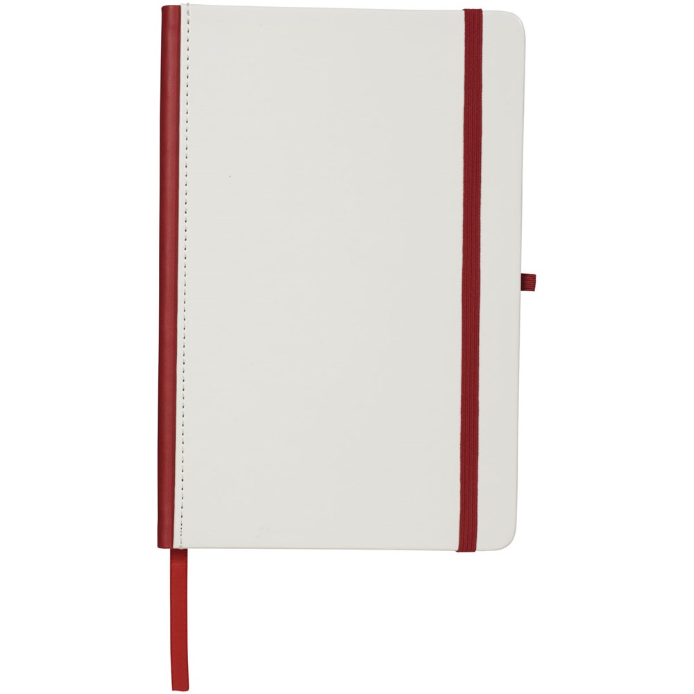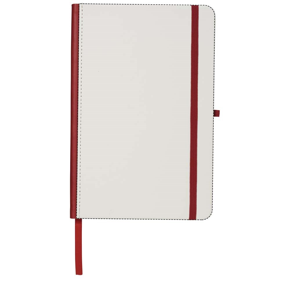 Wit hardcover A5 notitieboek met PU coating en een gekleurde rug. Ideaal voor volledig dekkend digitaal afdrukken. Met elastische sluiting in bijpassende kleur, lint als bladwijzer en elastische penlusje. 80 g/m2, 80 vellen crèmekleurig lijntjespapier.