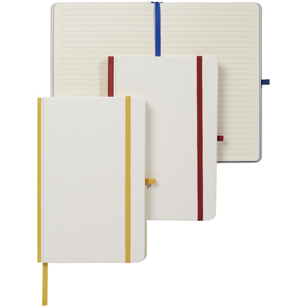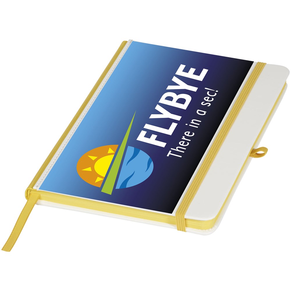 Wit hardcover A5 notitieboek met PU coating en een gekleurde rug. Ideaal voor volledig dekkend digitaal afdrukken. Met elastische sluiting in bijpassende kleur, lint als bladwijzer en elastische penlusje. 80 g/m2, 80 vellen crèmekleurig lijntjespapier.