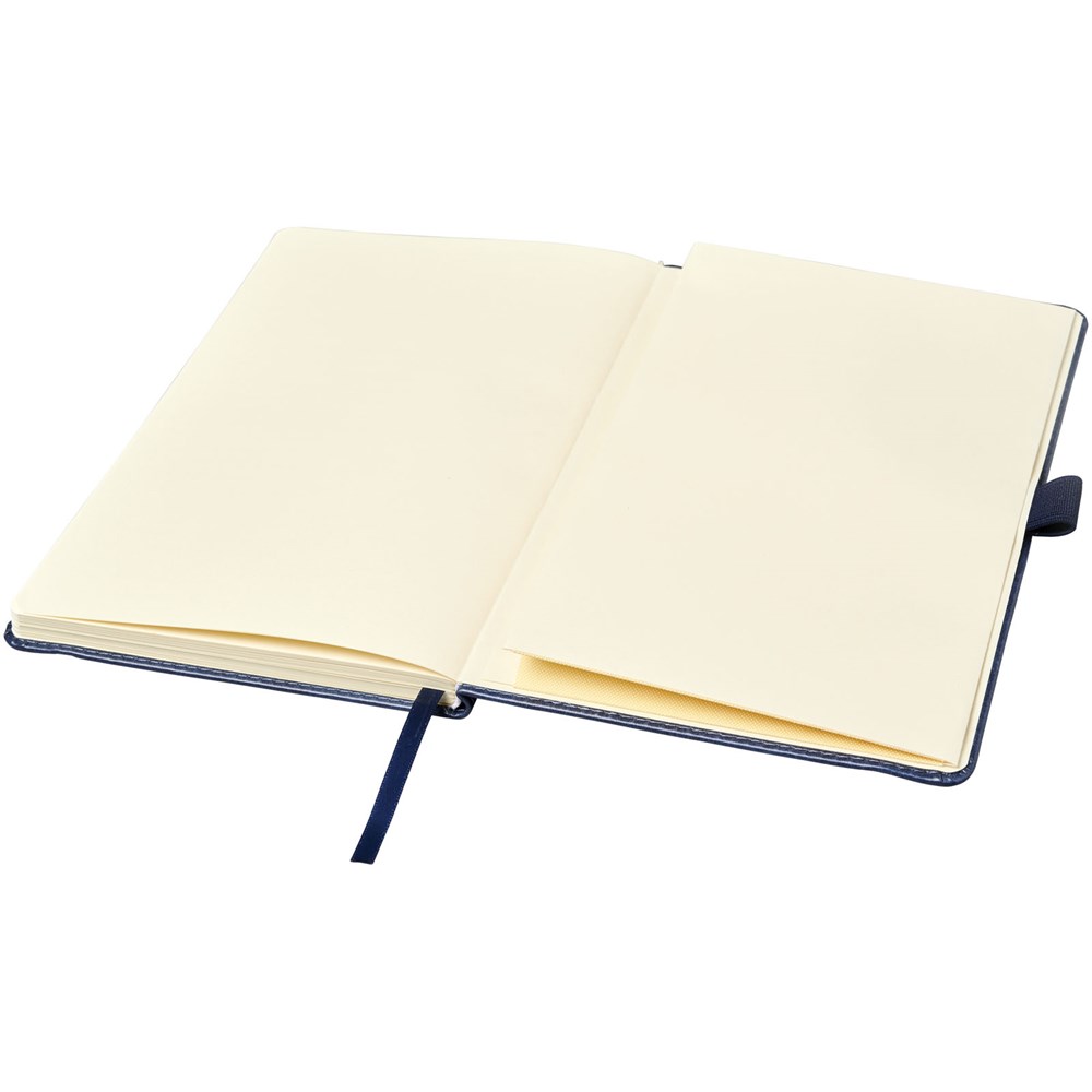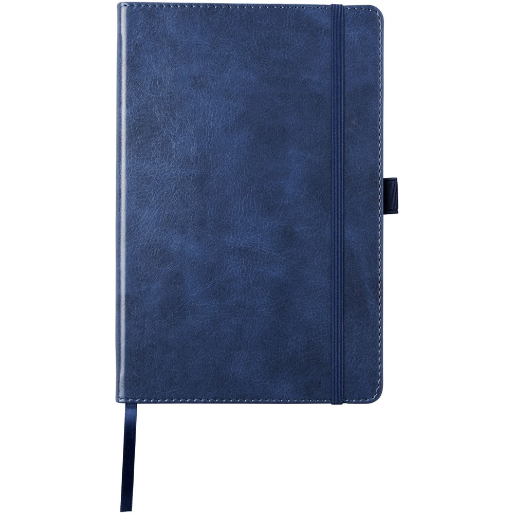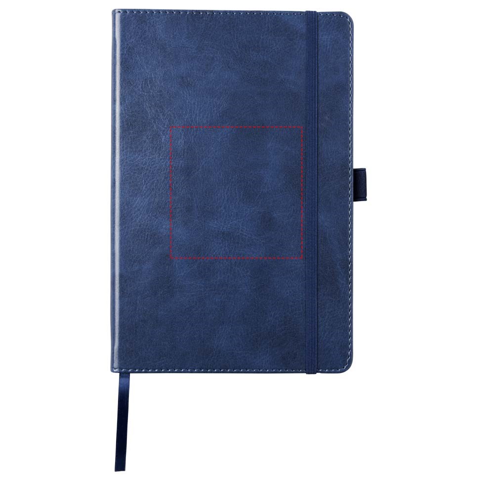 Lederlook (thermo PU) A5 notitieboek met hardcover en stiksels rond de randen en een ronde rug, geleverd in een luxe hoes. Specificaties: 70 g/m2 papier, 80 vellen crèmepapier, gelinieerde indeling, achterzak, elastische sluiting, leeslint en een pennenlus.