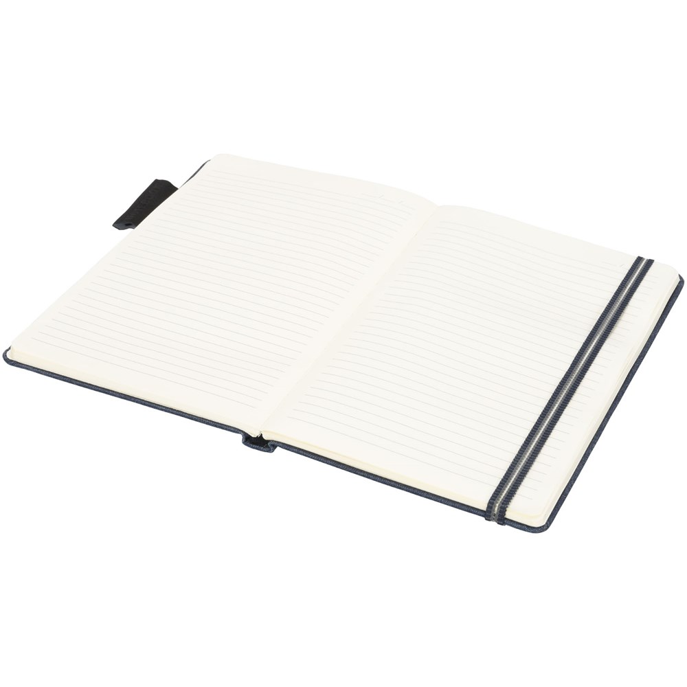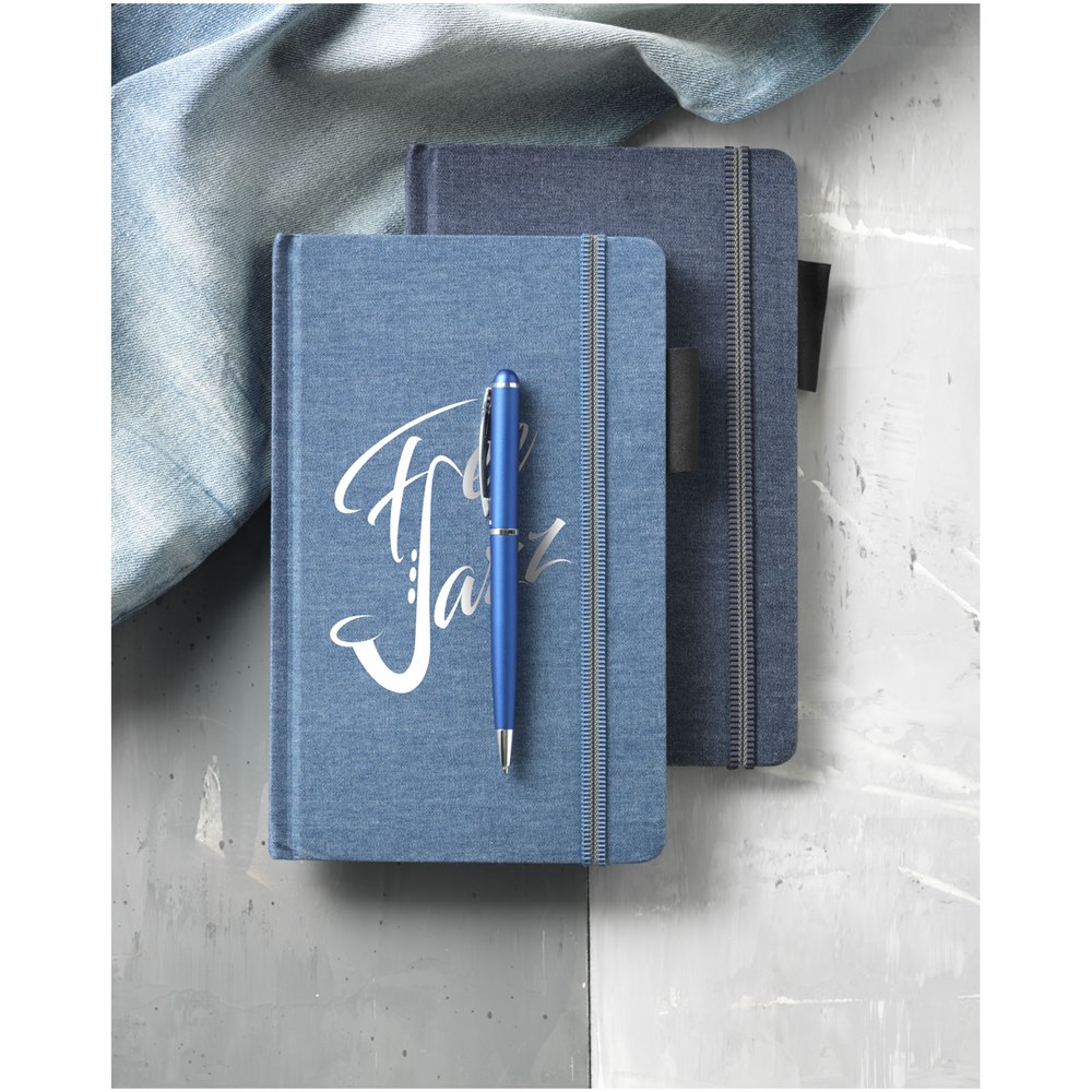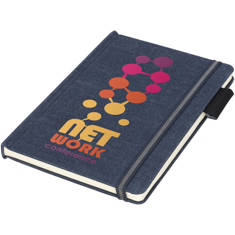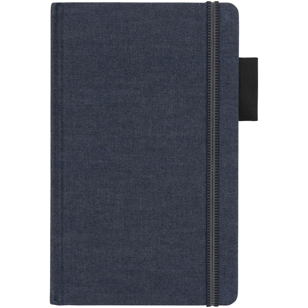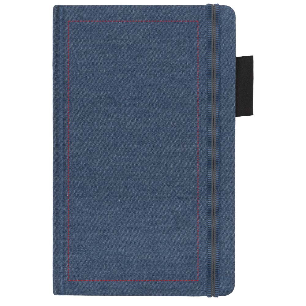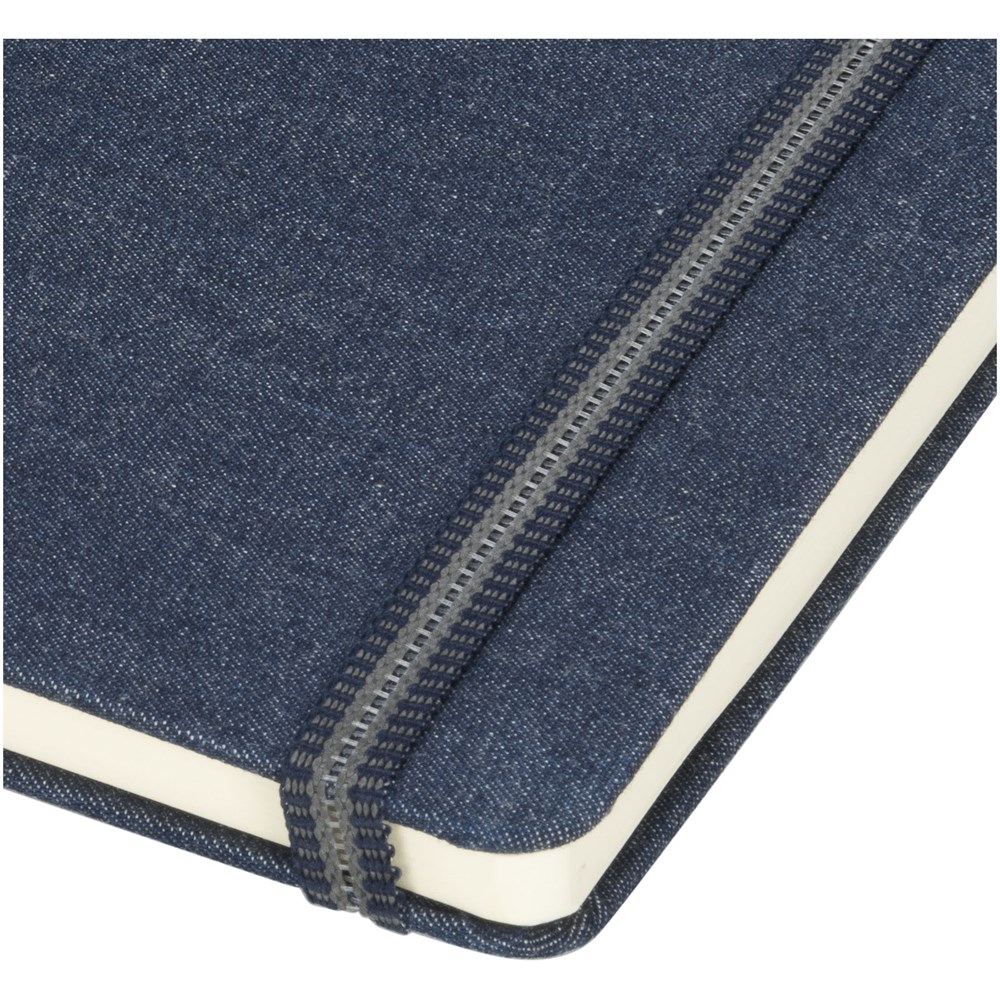 A5-formaat notitieboek van jeansstof met 80 bladen (80gsm) crèmekleurig lijntjespapier, speciaal ontworpen elastische sluiting, bladwijzer en penlus. Gepresenteeerd in een geschenkverpakking.