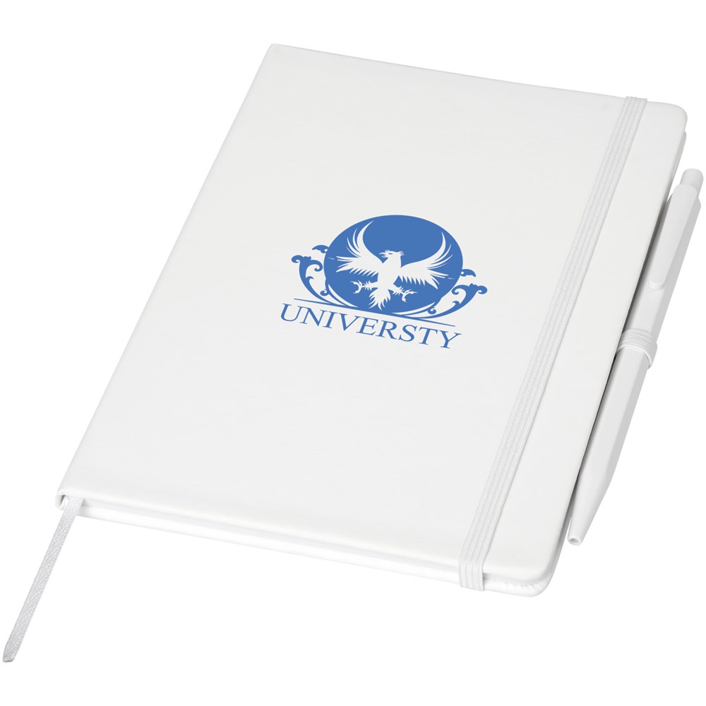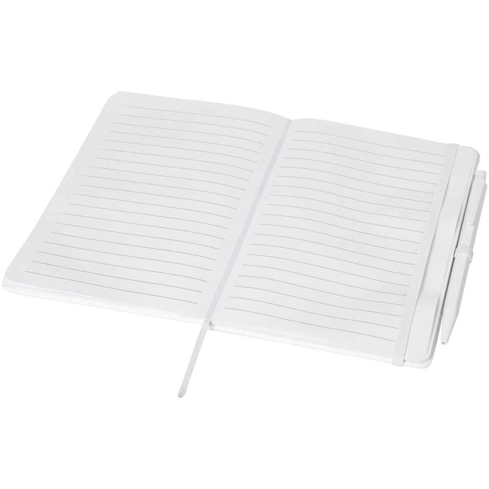 Hardcover notitieboek inclusief pen met bijpassende elastische sluiting in kleur, lint als bladwijzer en pennenlus. Voorzien van 50 vellen wit gelinieerd papier. Bijpassende pen in kleur met zwarte navulbare inktvulling.
