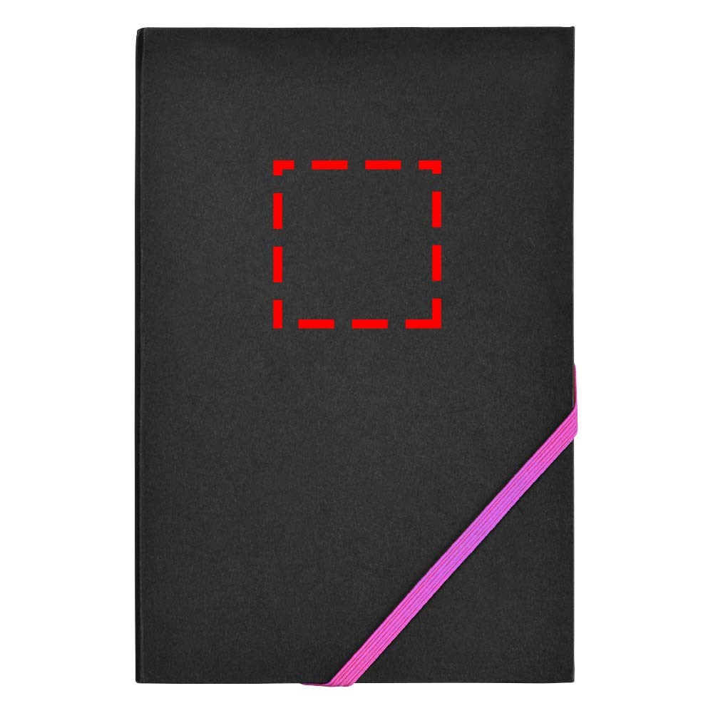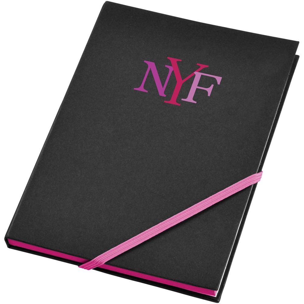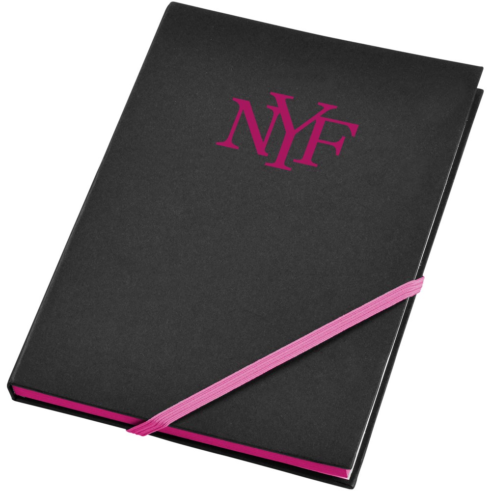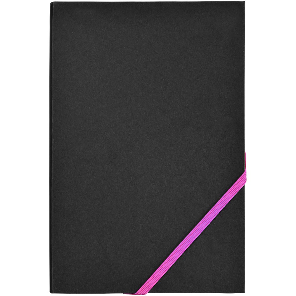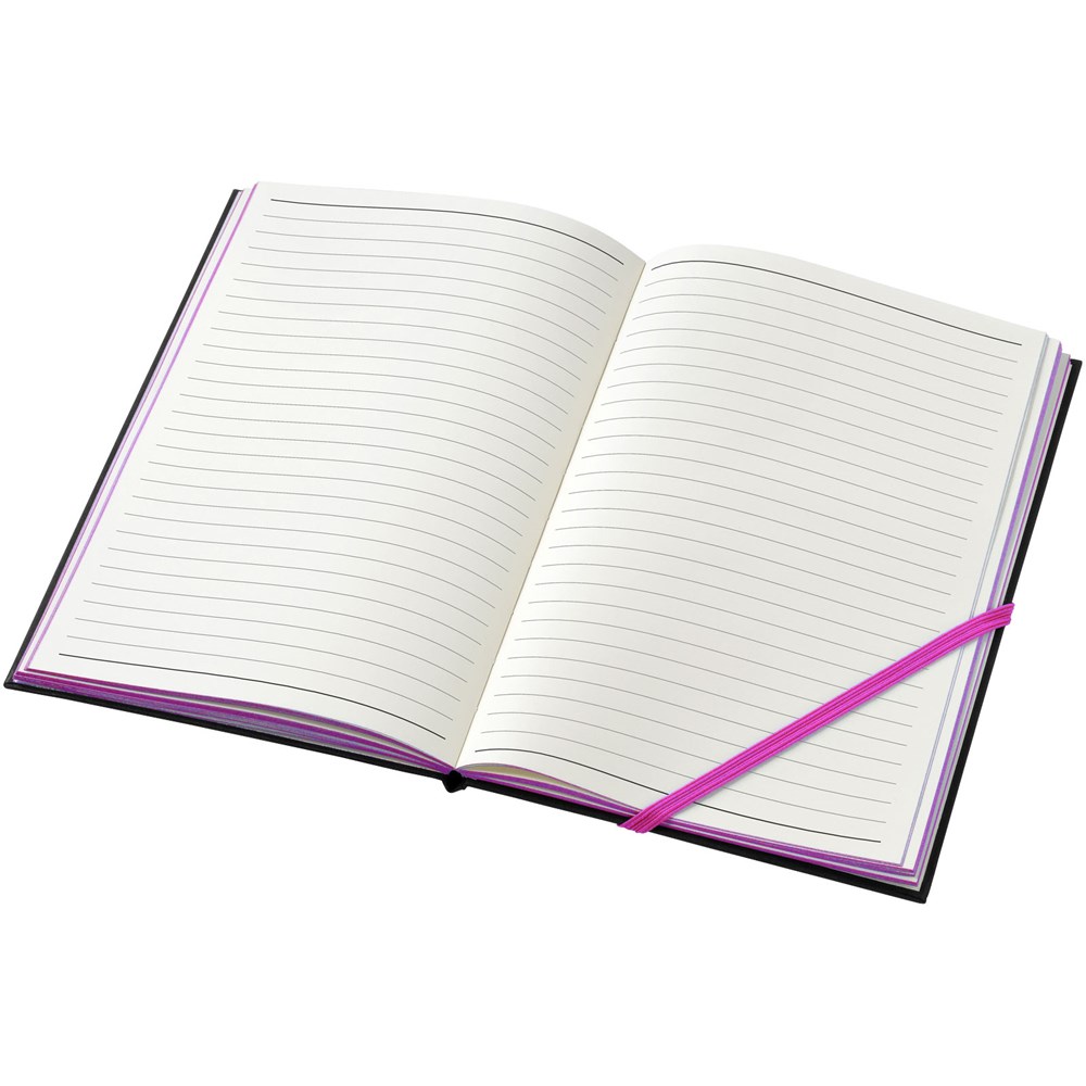 A5 formaat notitieboek met 80 pagina's van 70 gram gelinieerd papier met diagonale elastieksluiting en rand in spetterende neonkleuren.