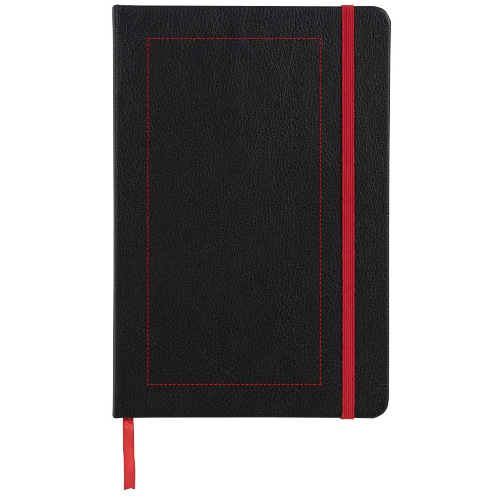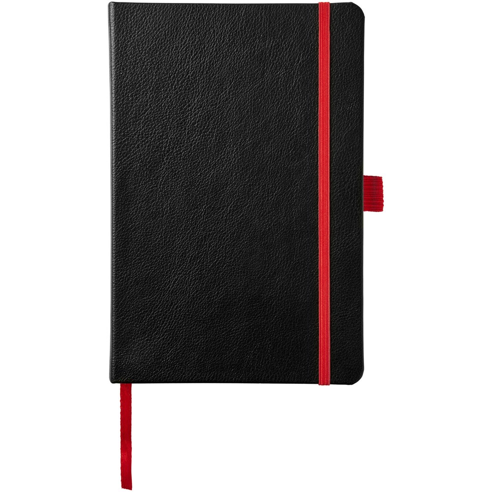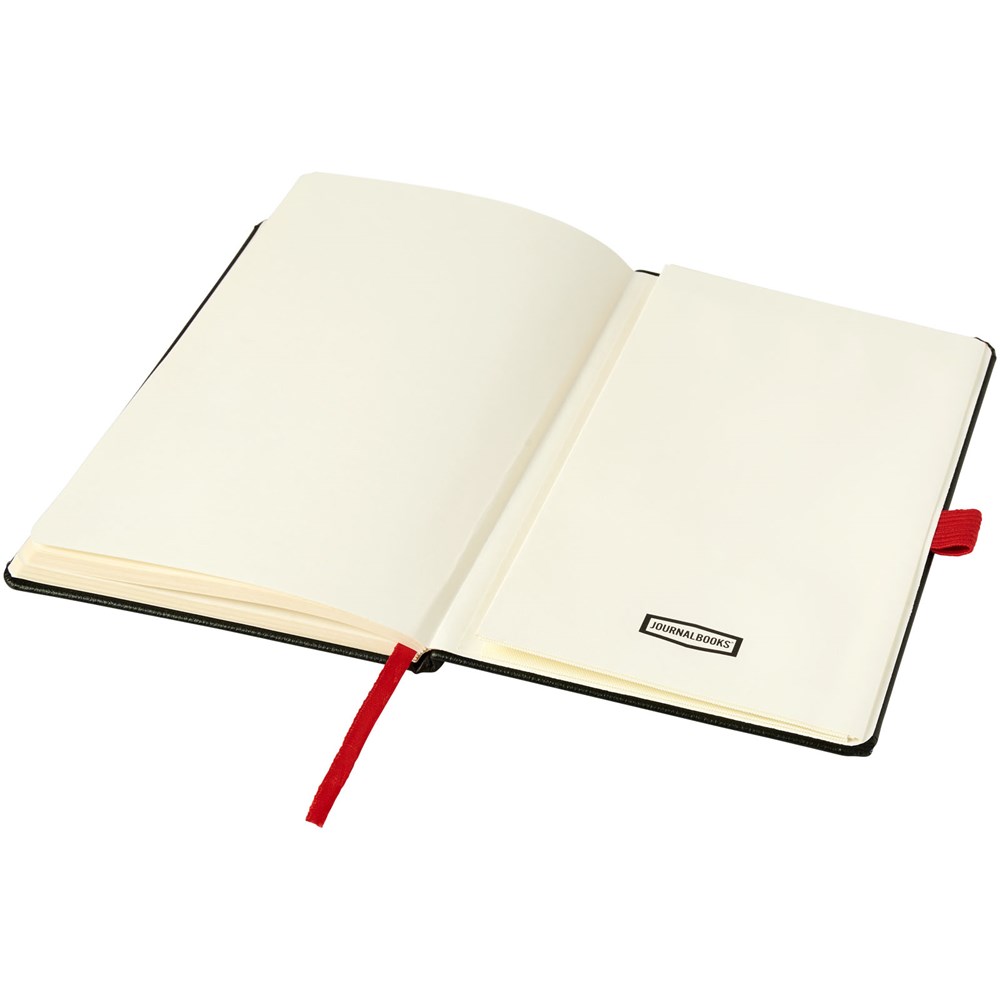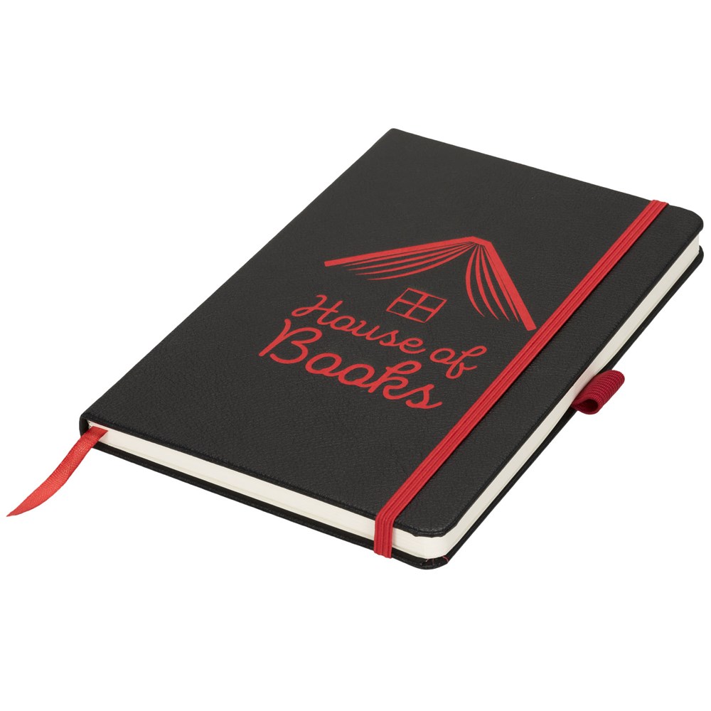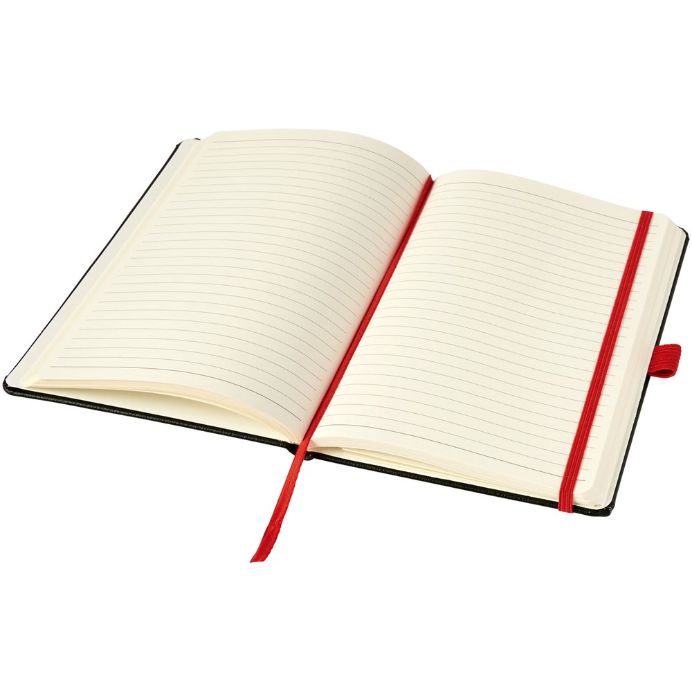 A5 formaat notitieblok met harde kaft, met uw logo of merknaam in blauw, rood, groen of geel na lasergravure. Inclusief elastische sluiting in bijpassende kleur, bladwijzer en elastisch penlusje. 80 g/m2, 80 vellen crèmekleurig lijntjespapier. Heeft tevens een uitbreidbaar vakje aan de achterkant voor kleine notitieblaadjes. Verpakt in een hoes.