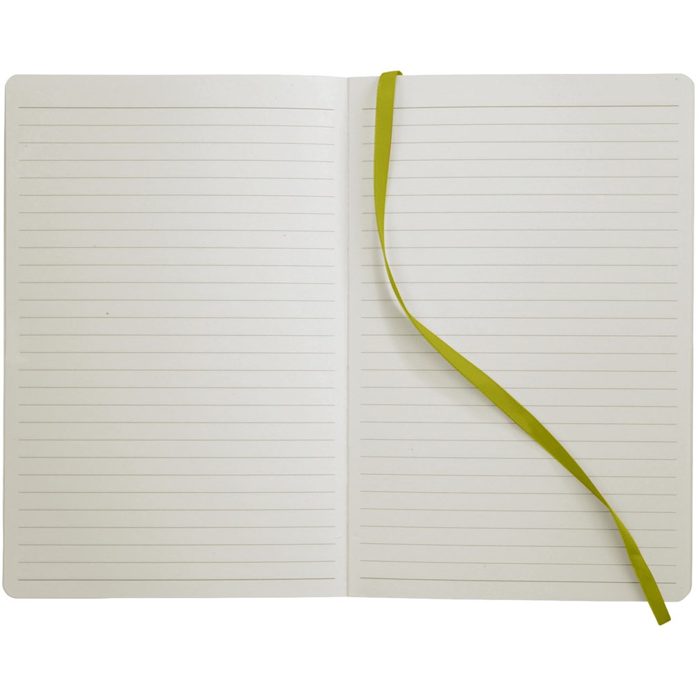 Soft touch cover notebook A5 formaat met ingebouwde elastieksluiting, paginalint, opbergvak aan de binnenkant en 80 pagina's van 80 gram gelineerd papier.