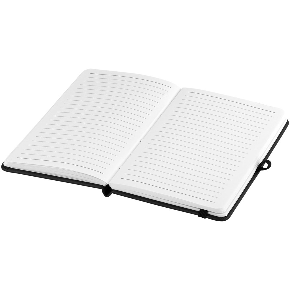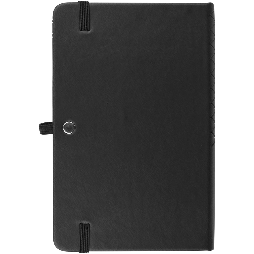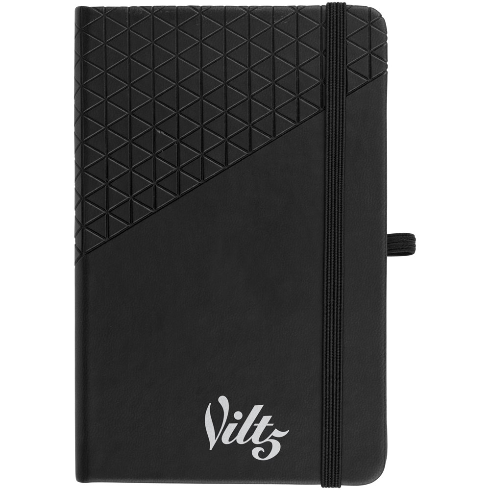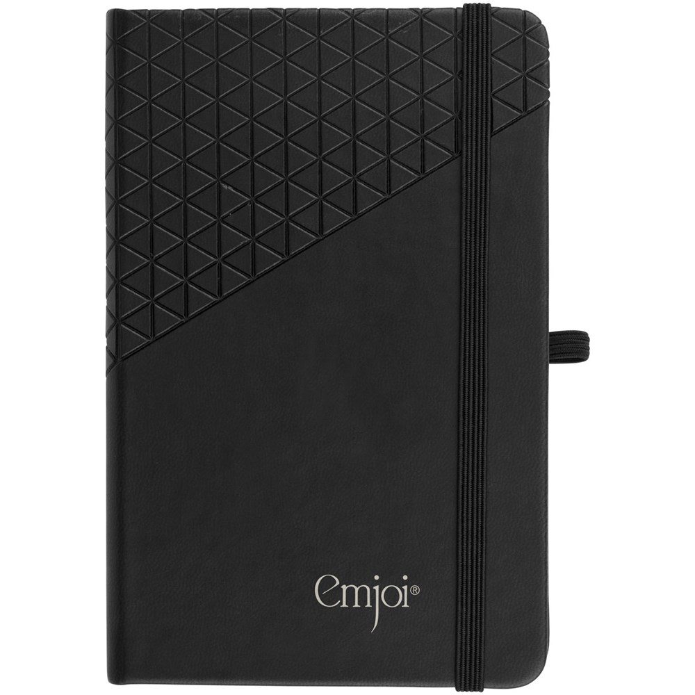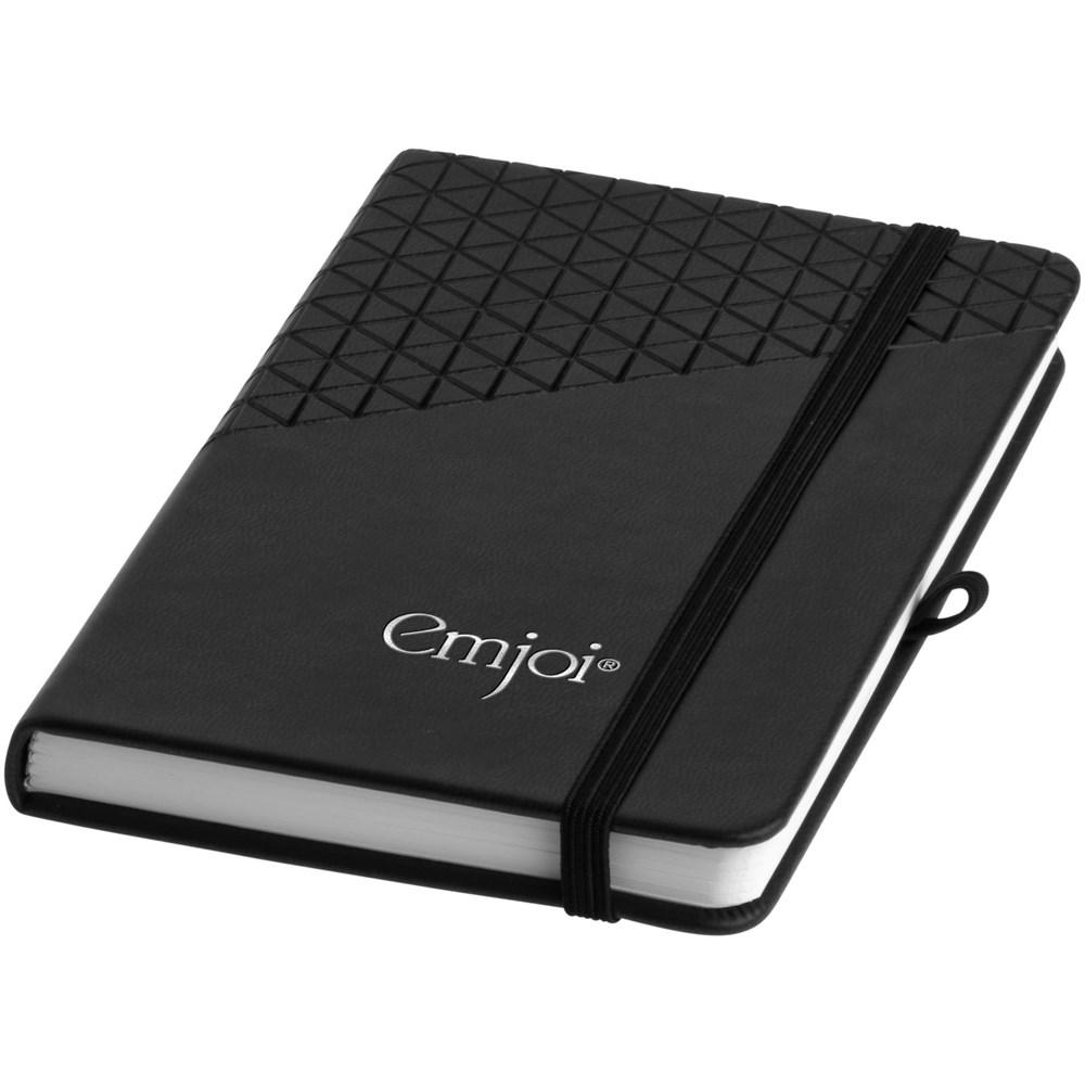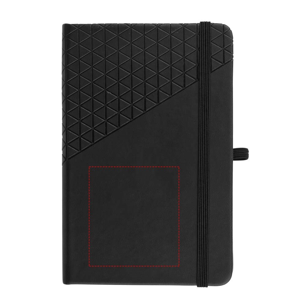 Soft touch A6 formaat notitieboek met geometrisch patroon design. 80 pagina's van 80 gram gelinieerd papier, paginalint, elastieksluiting en penlus.