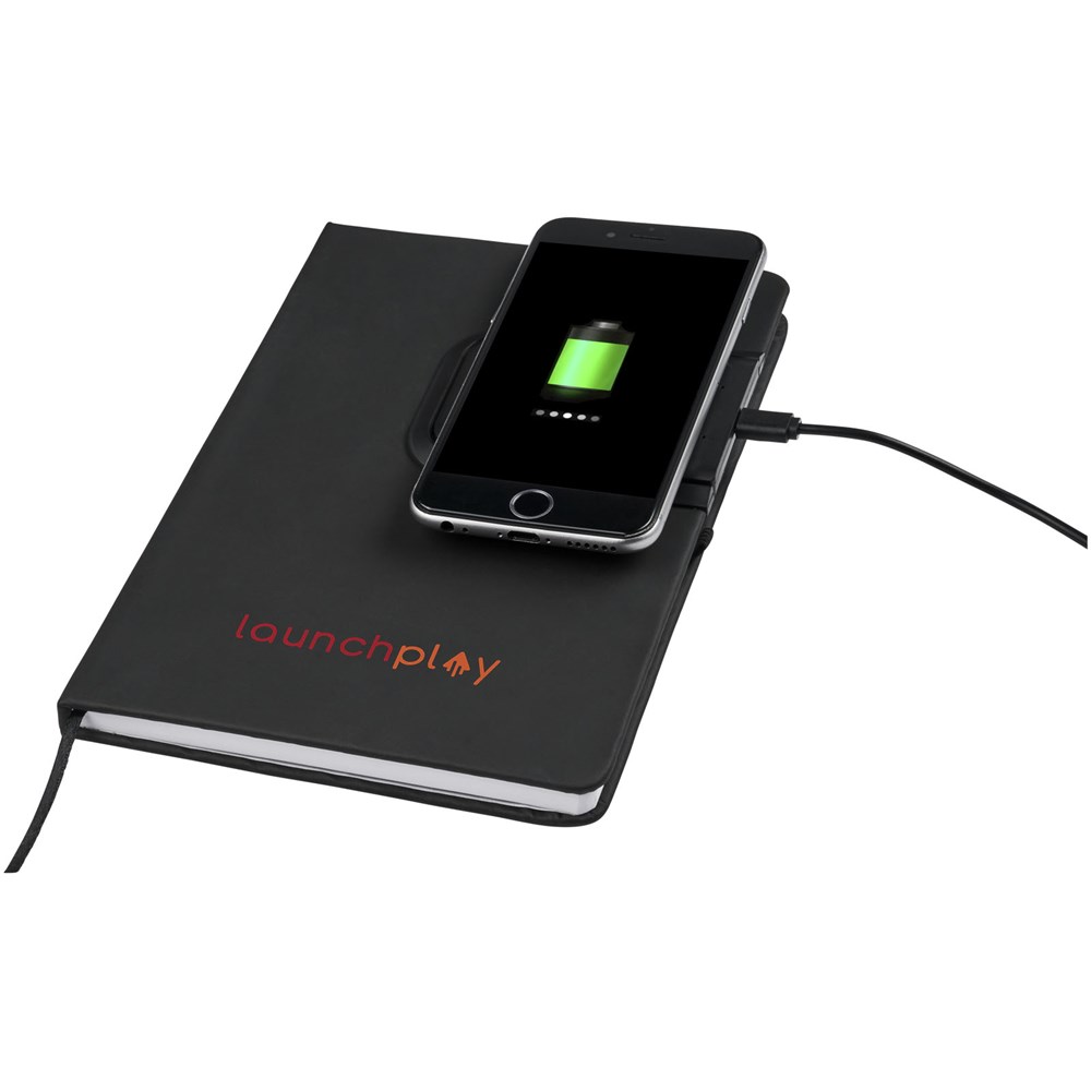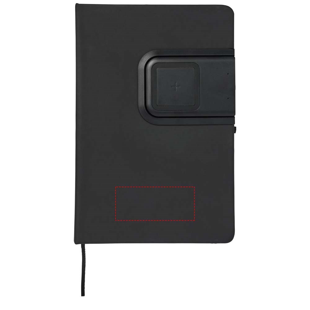 Notitieboekje in A5 formaat met afneembare draadloze oplader (ingang 5 V, 5 A/uitgang 5 V, 0,8 A) op de omslag. Het notitieboek heeft 80 vellen, 70-grams gelinieerd papier.