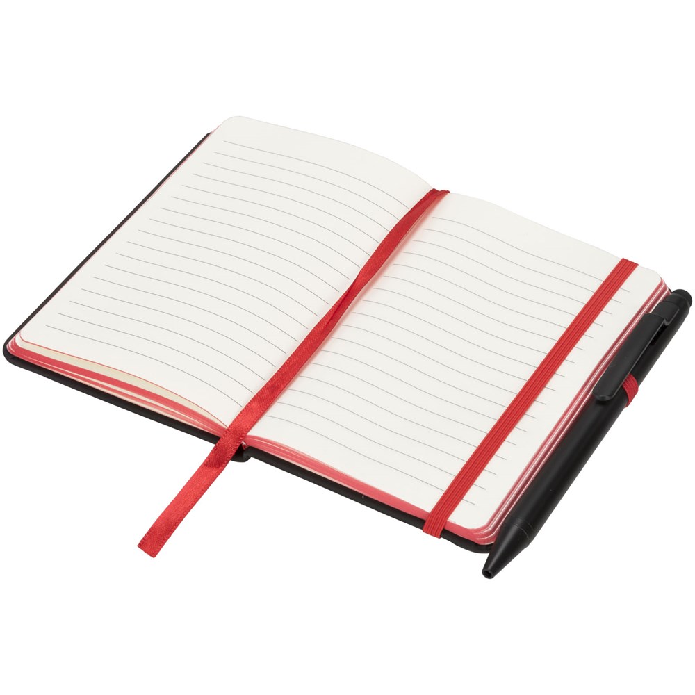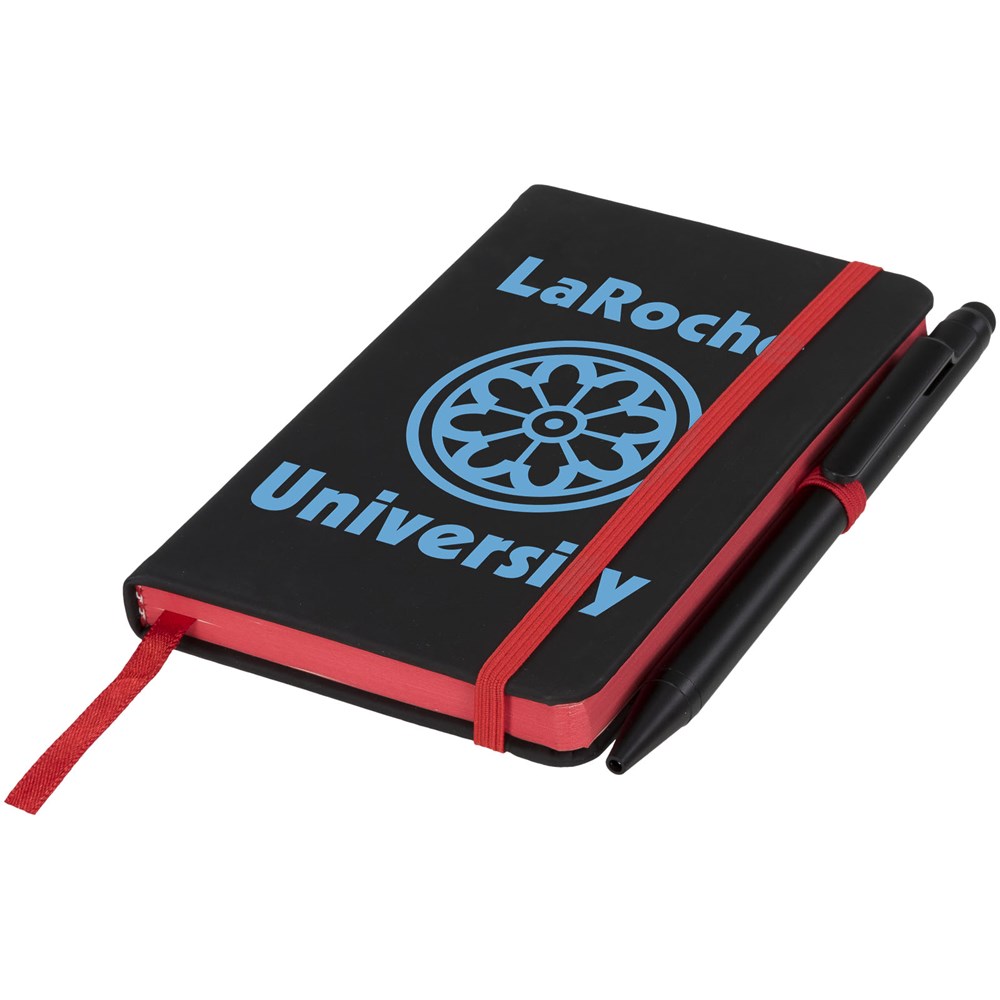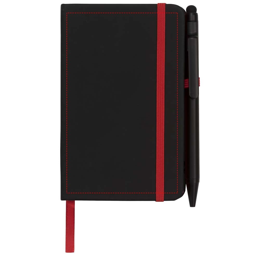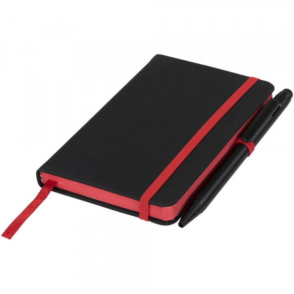 Modern en stijlvol zwart notitieboek met een zachteomslag. Voorzien van gekleurde randen bladwijzer, penlus en sluitband in een bijpassende kleur. Inclusief effen zwarte stylus balpen. Bevat 96 bladen (70g/m2) crèmekleurig gelinieerd papier.
