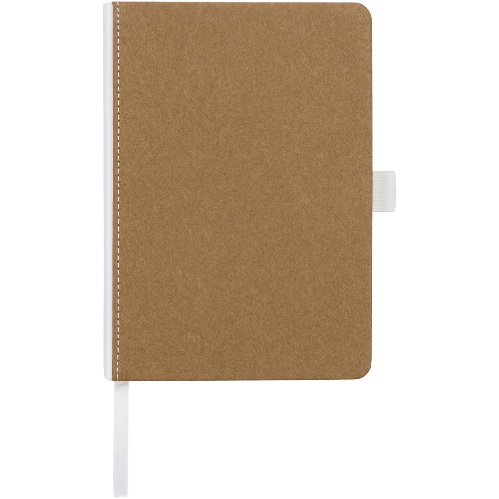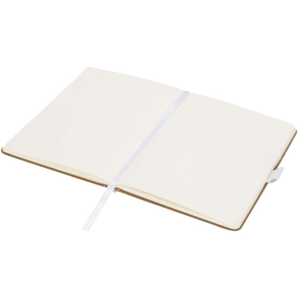 Kartonnen notitieboek met stoffen rug en naturel-look. Beschikt over 80 (70gsm) blanco pagina, een bladwijzer en penlus.
