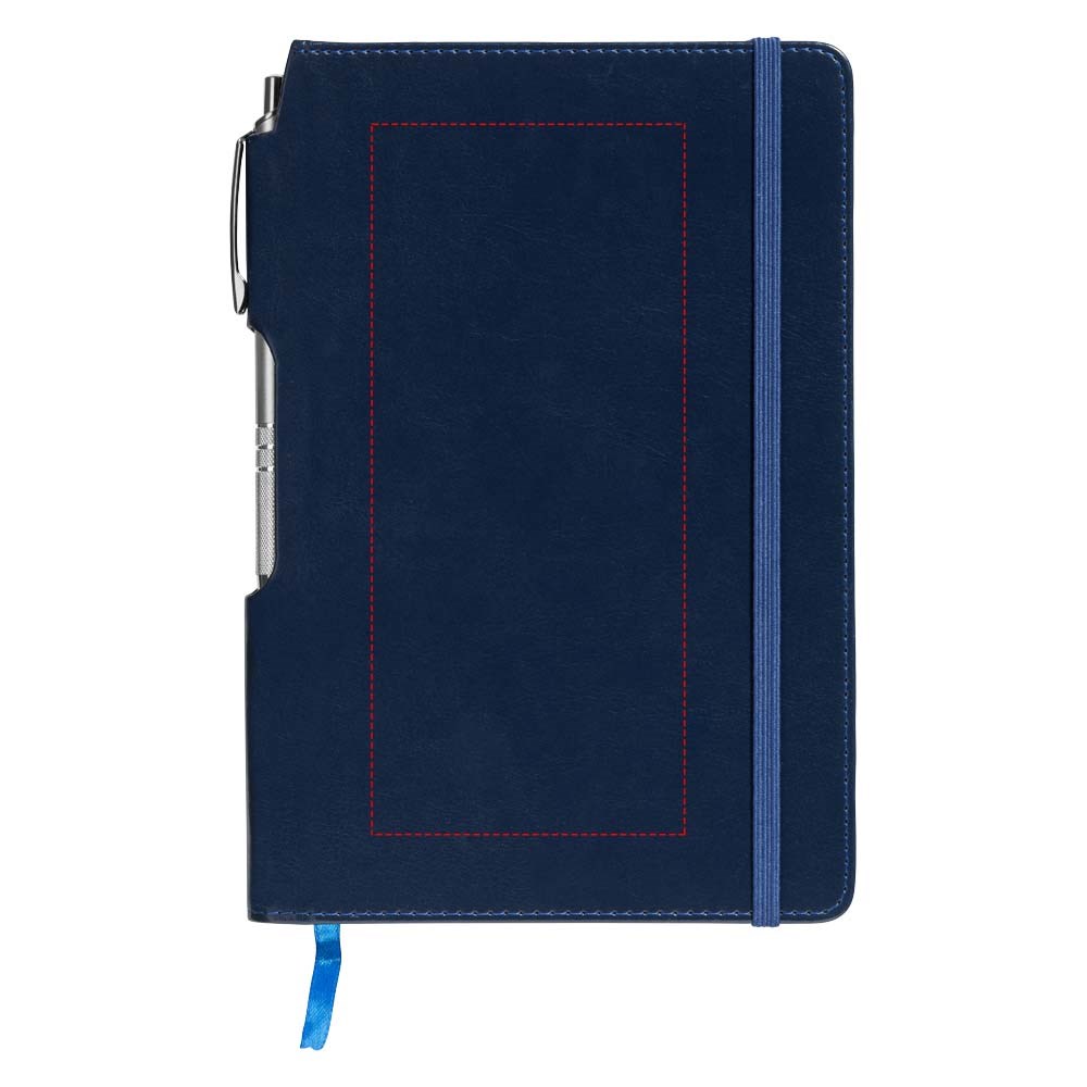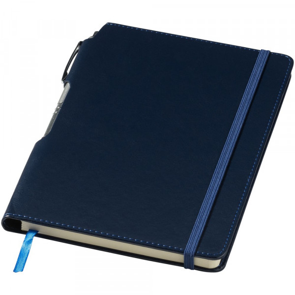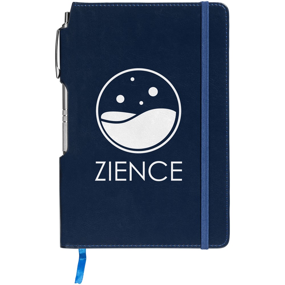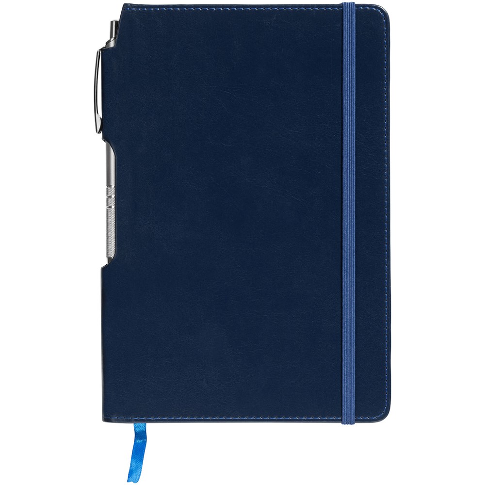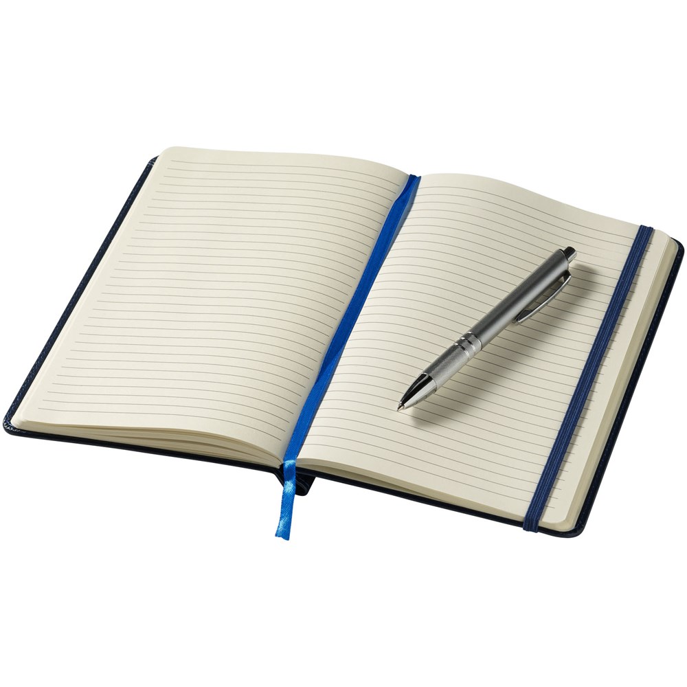 A5 formaat notitieboek met 80 pagina's van 70 gram gelinieerd papier, paginalint en elastieksluiting in bijpassende kleur en zilverkleurige balpen in de binding.