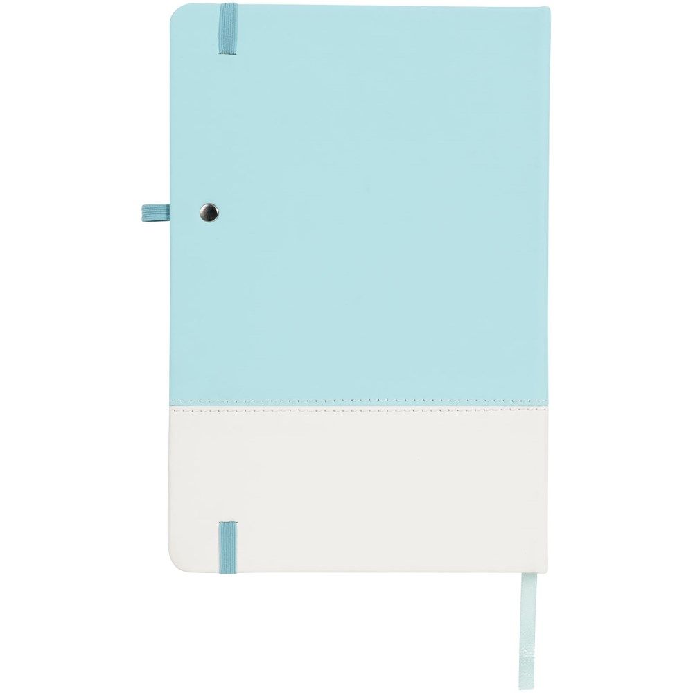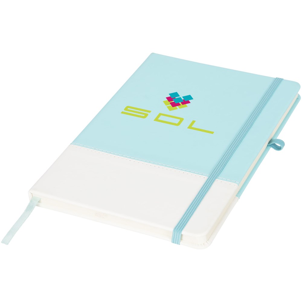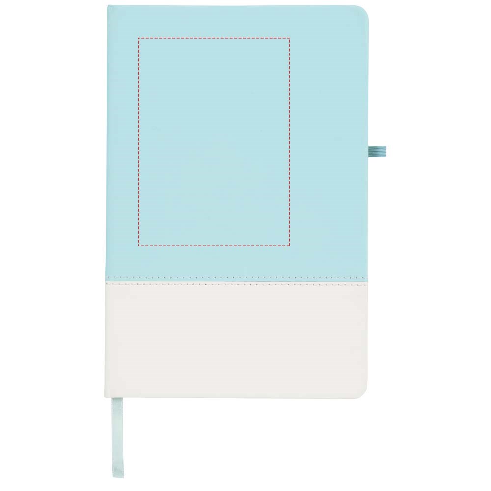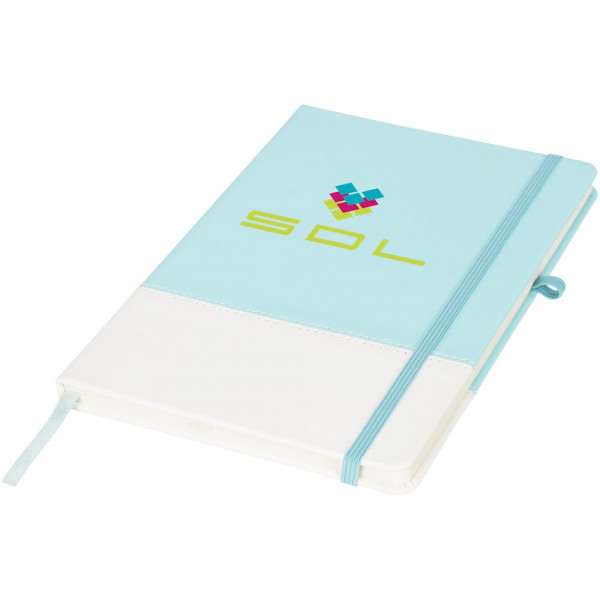A5 notitieblok met omslag met kleurenblokken in twee tinten. Omvat 80 bladen (70g/m2) gelinieerd papier.