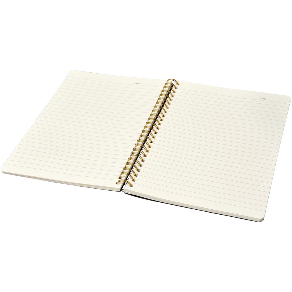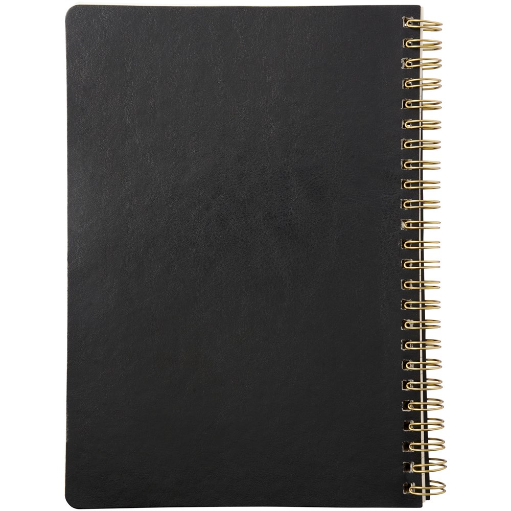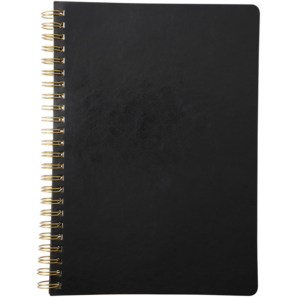Lederlook A5 schrift met spiraal in runderhuid thermo PU en afgeronde hoeken. De kaft van het notitieboekje (15 cm x 21 cm) heeft 96 vellen gelinieerd crèmepapier in 70 g/m2.