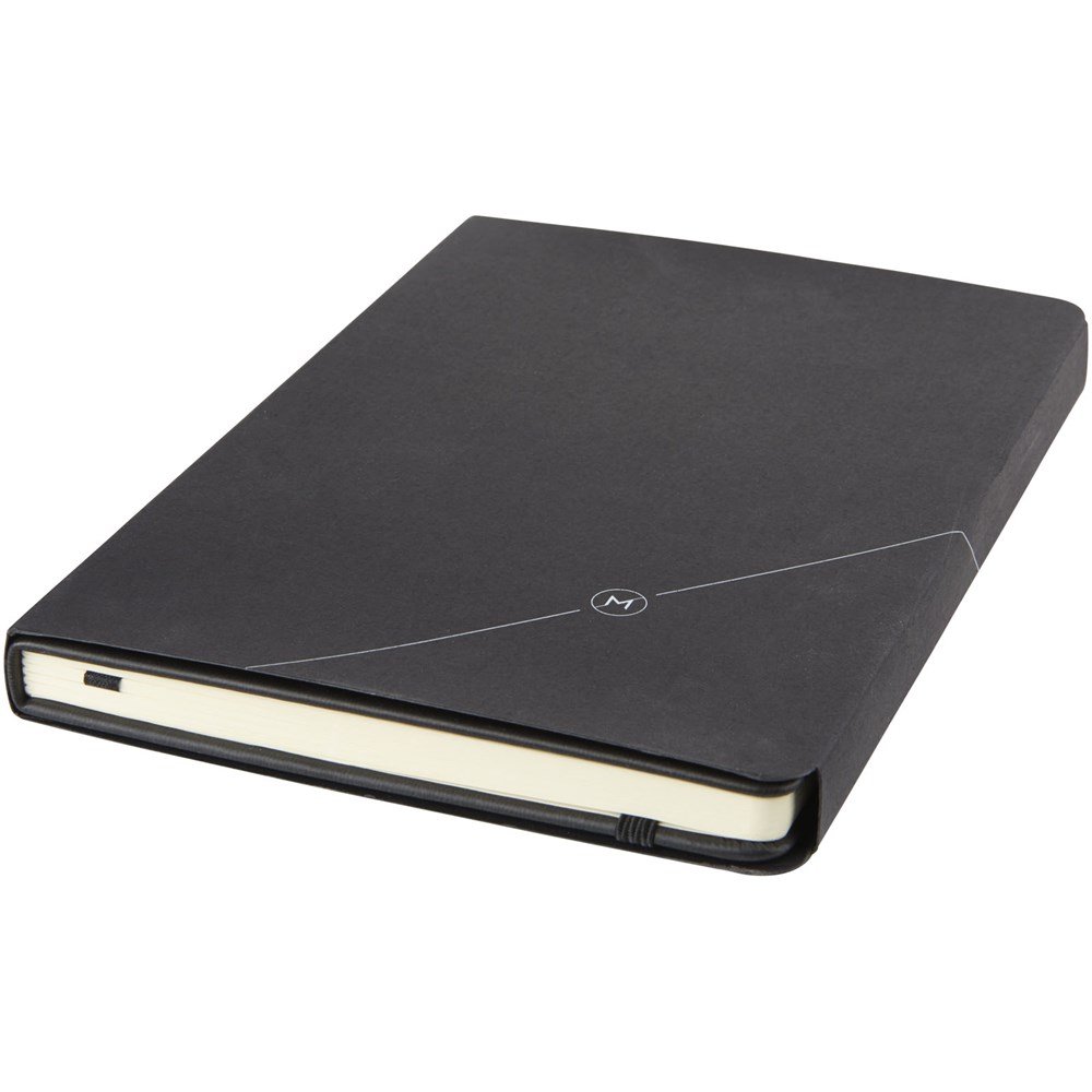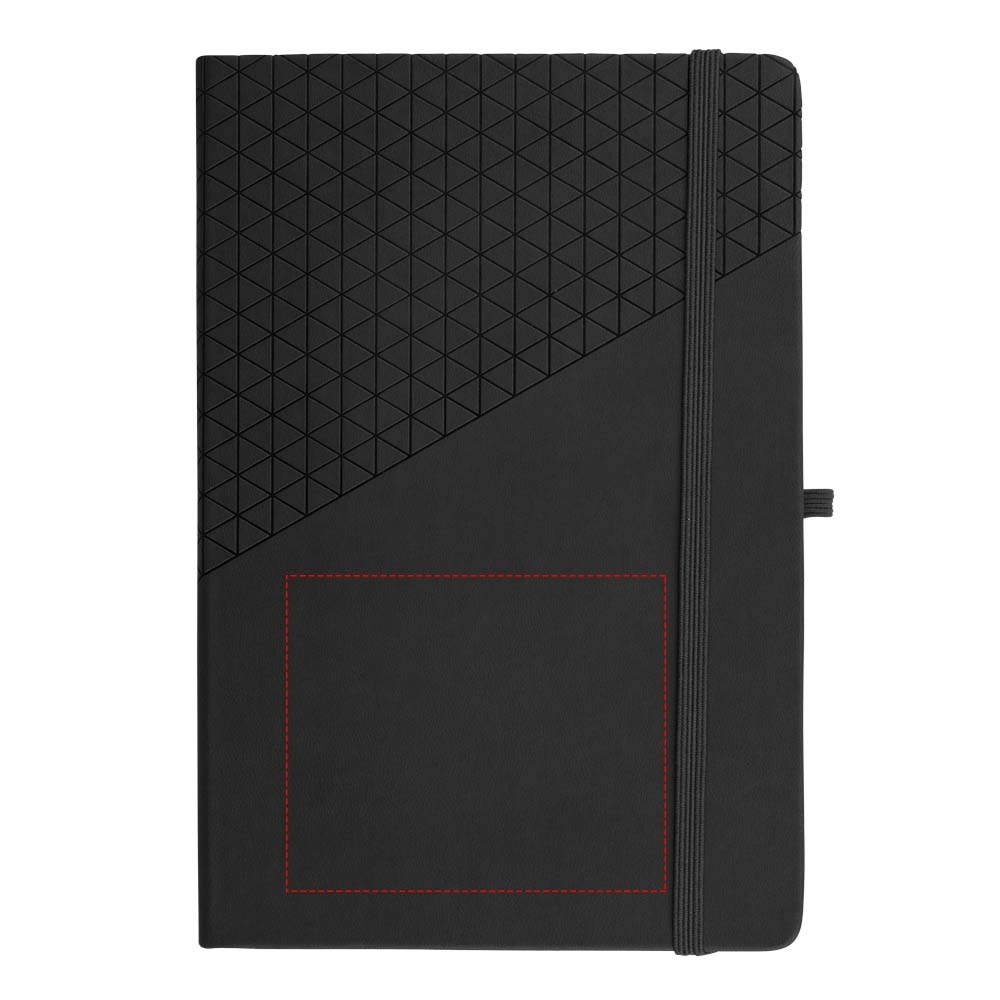 Soft touch A5 formaat notitieboek met geometrisch patroon design. 80 pagina's van 80 gram gelinieerd papier, paginalint, elastieksluiting en penlus.