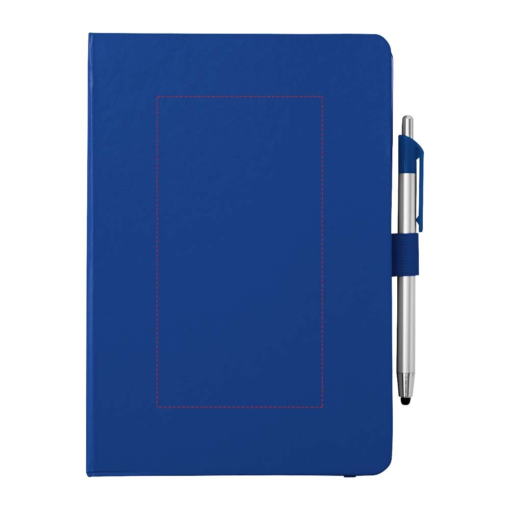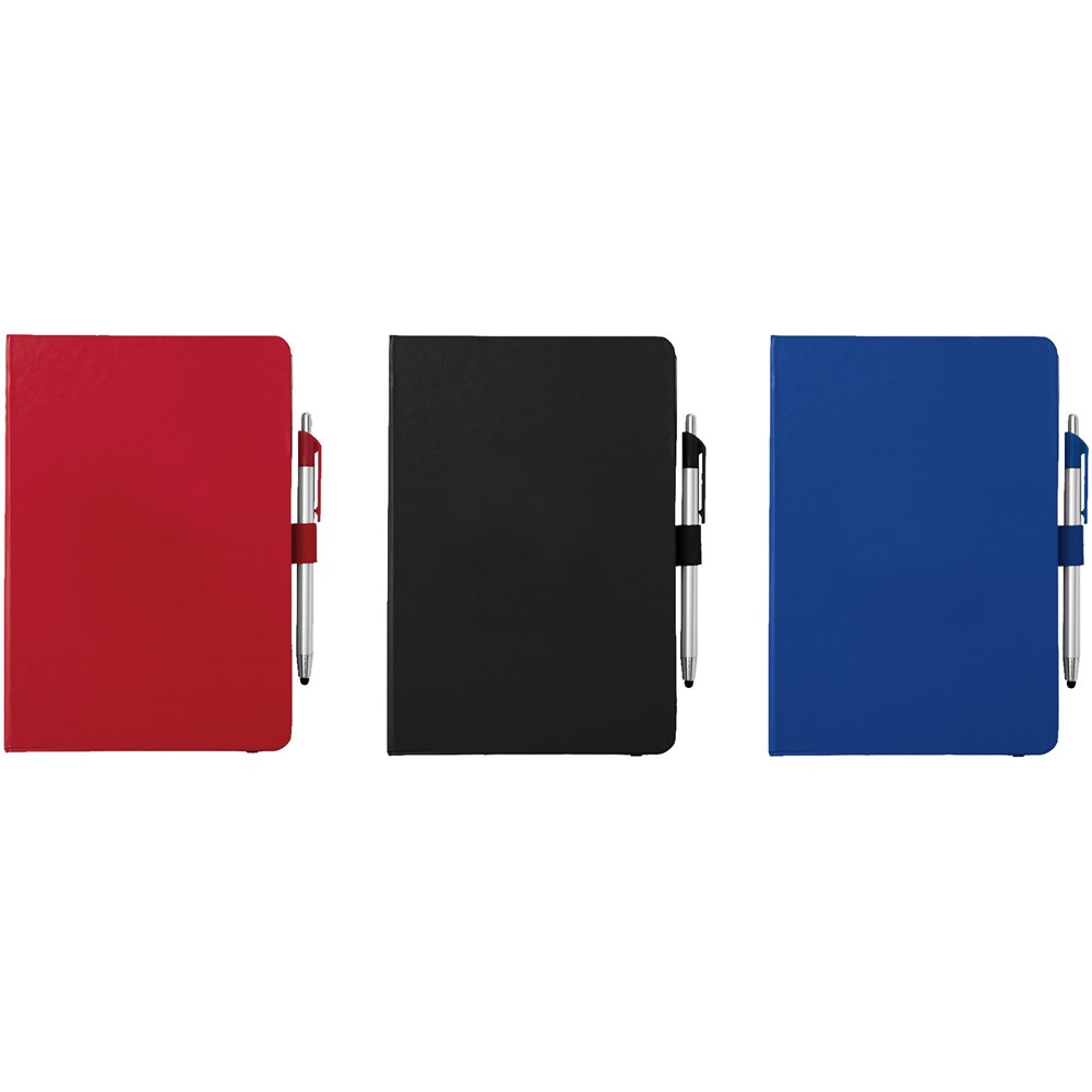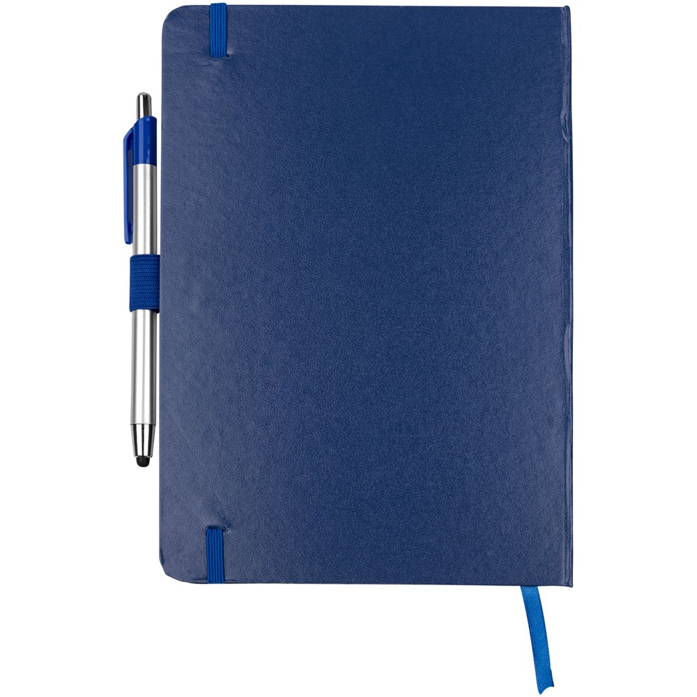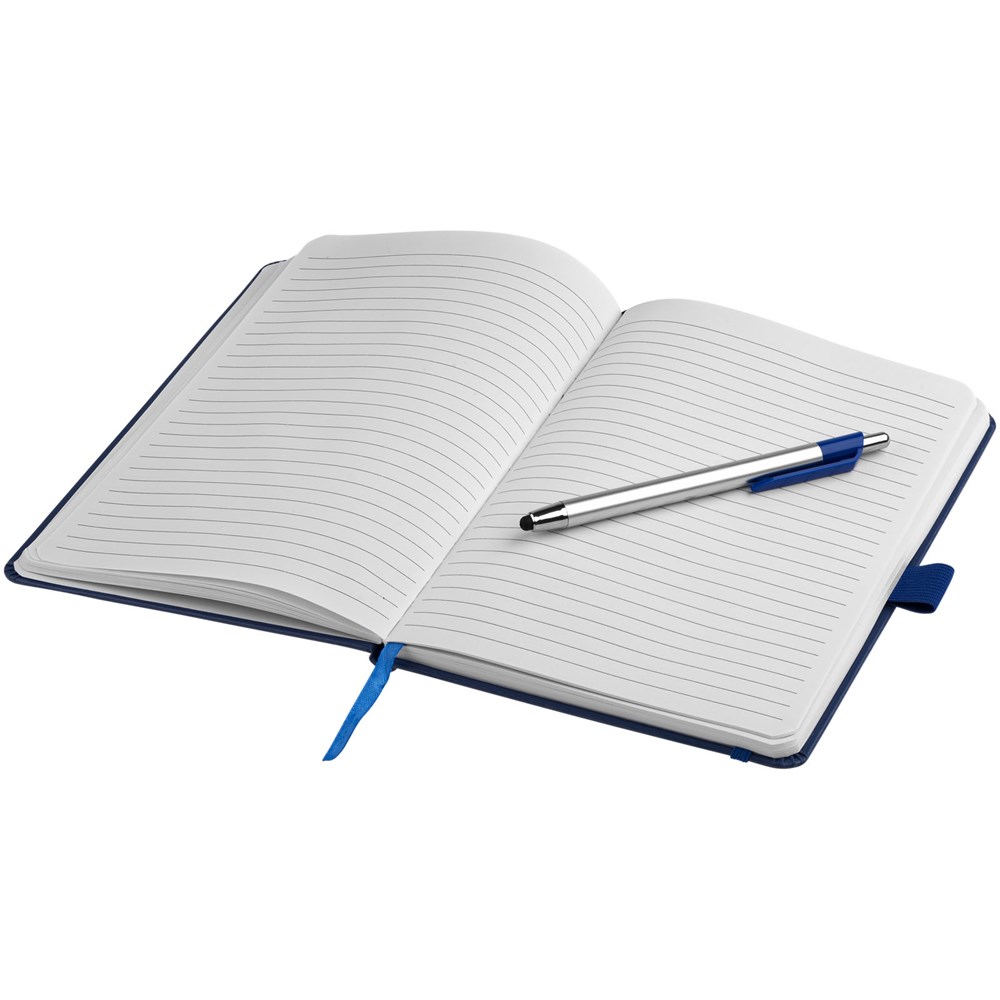 Ingebonden notitieboek met elastieksluiting en paginalint in dezelfde kleur. Met kunststof stylus balpen, pen apart verpakt en 80 pagina's van 70 gram gelinieerd papier.
