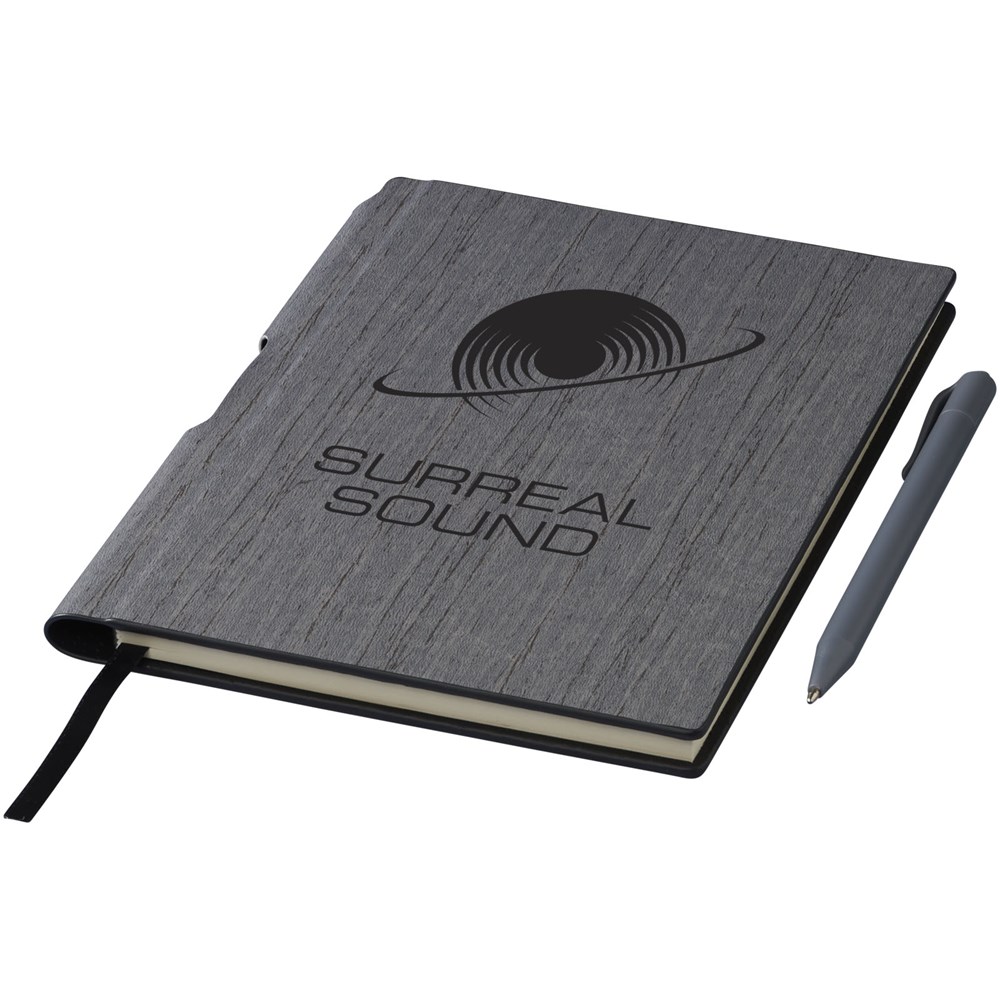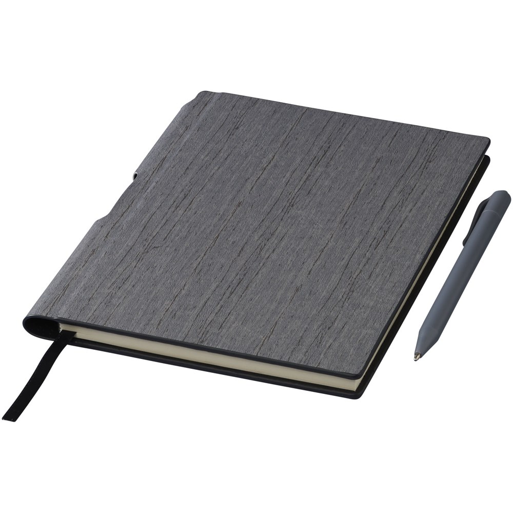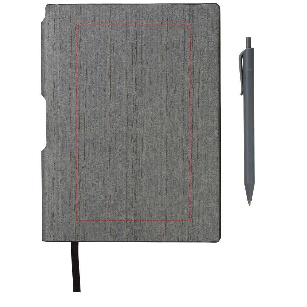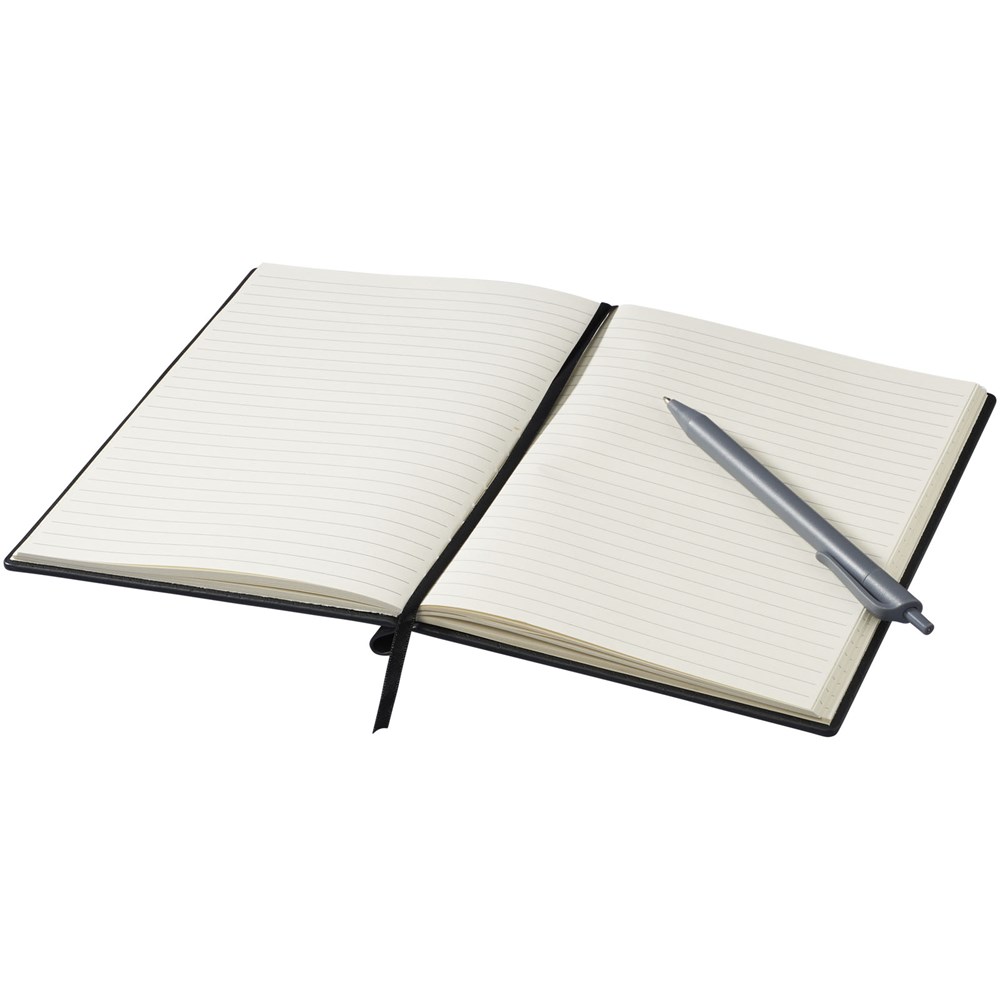 Ingebonden A5 formaat notitieboek met 80 pagina's van 70 gram gelinieerd papier. Bijpassende kunststof balpen in de binding.