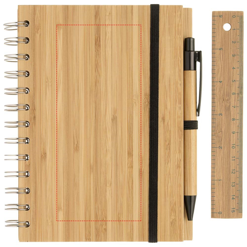 Bamboe B6 formaat notitieboek met 70 pagina's van 70 gram gelinieerd papier, bijpassende pen en liniaal. Decoratie is niet mogelijk op de losse onderdelen.
