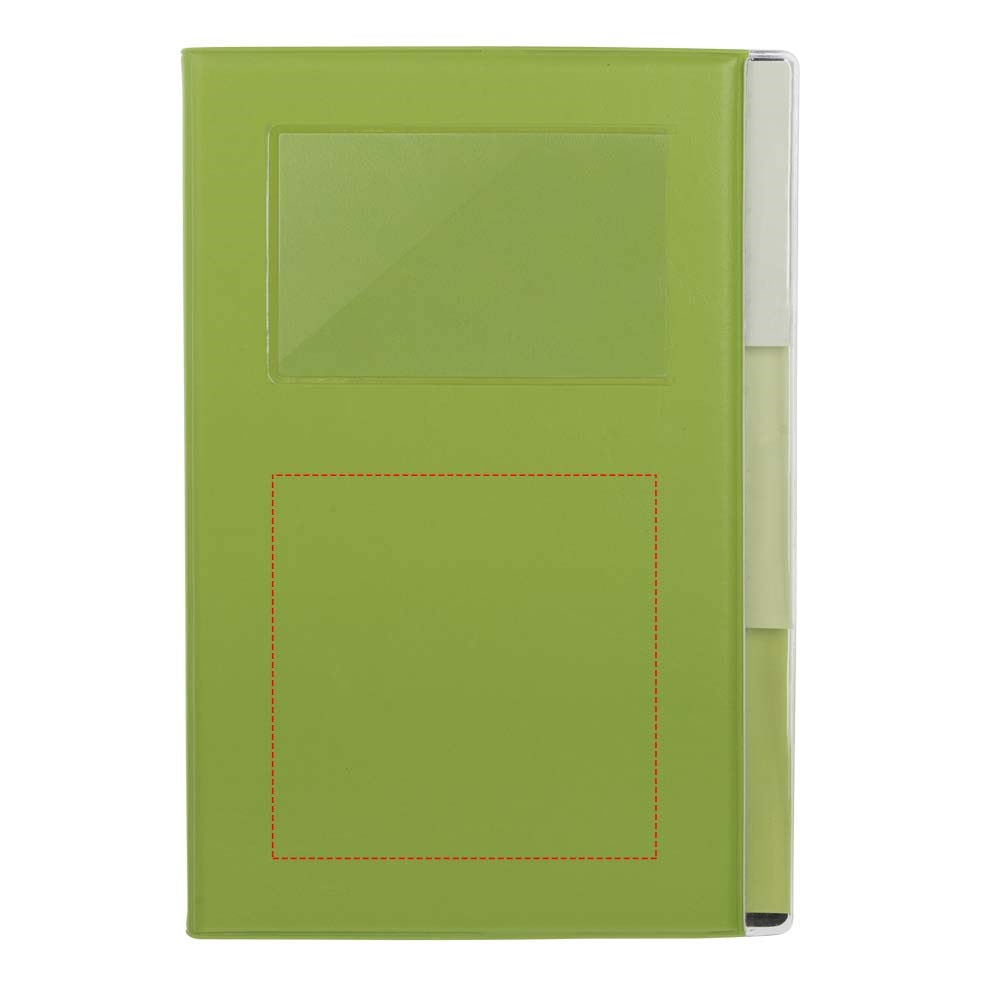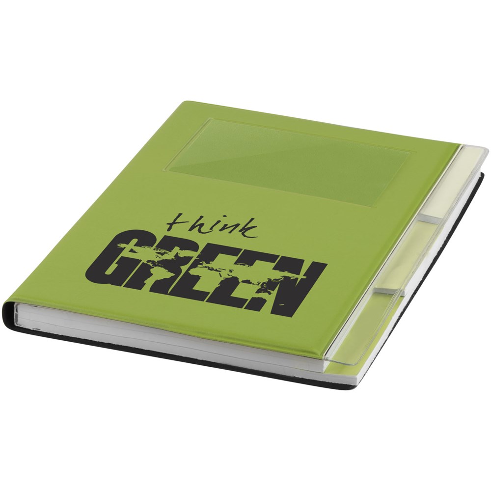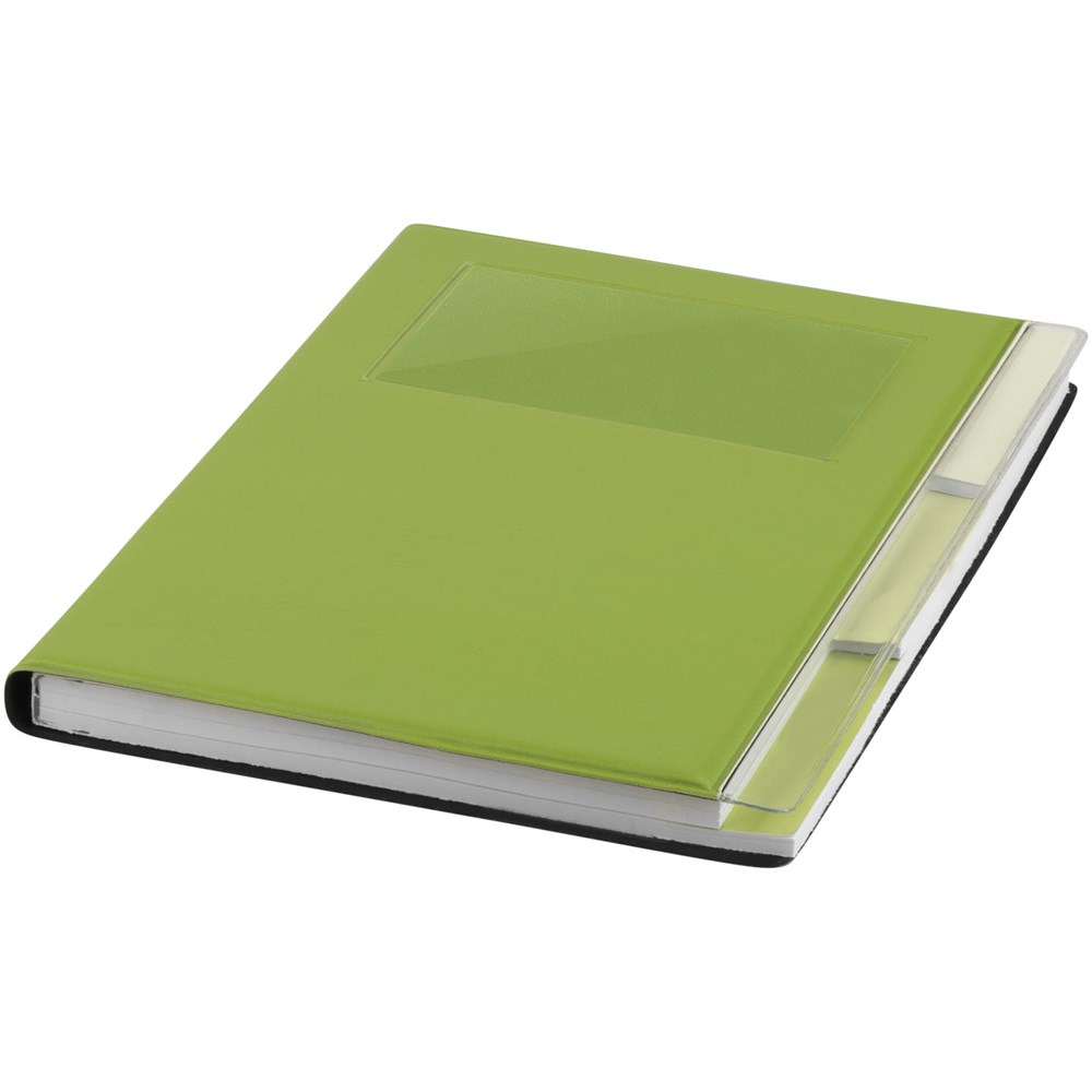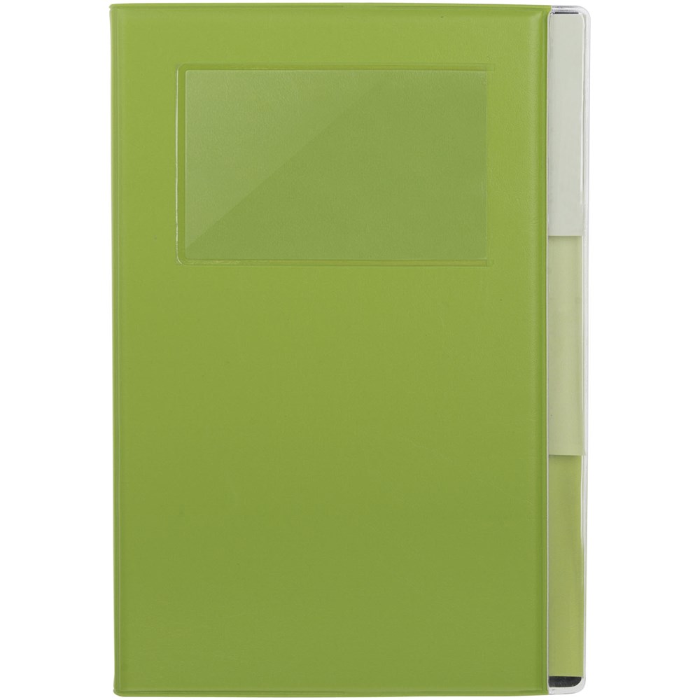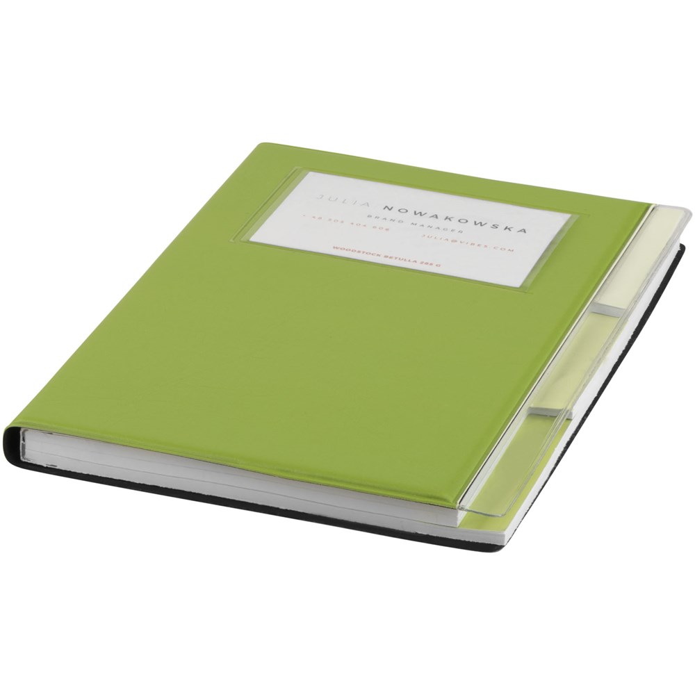 A5 formaat notitieboek met visitekaart ID venster op de voorkant. 120 pagina's van 70 gam gelinieerd papier met drie gekleurde scheidingspagina's.