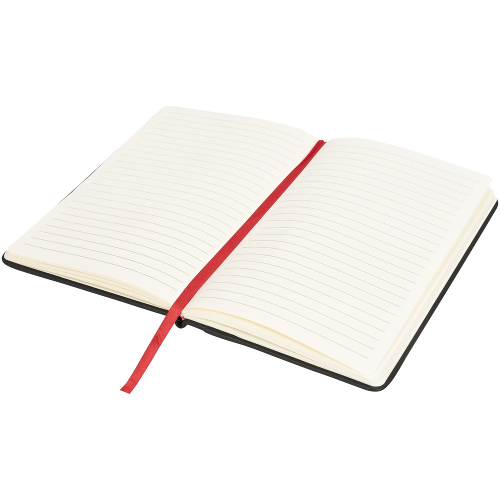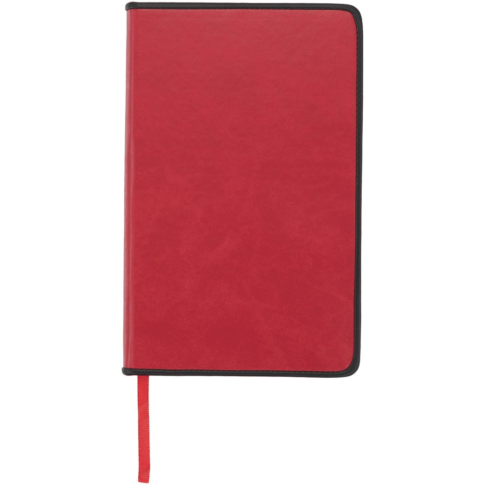 Notitieboek met een tijdloze look en uitstraling, verkrijgbaar in vier kleuren. Gladde hardback omslag met een zachte zwarte rand van PU. Bevat 96 bladen (70g/m2) crèmekleurig gelinieerd papier.
