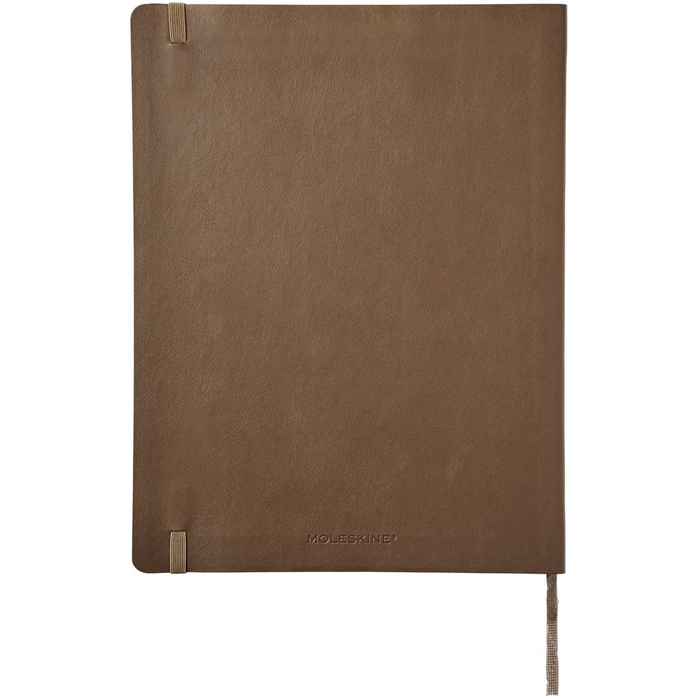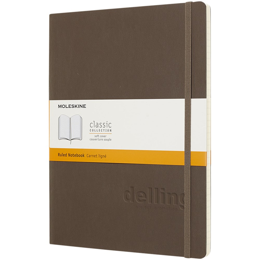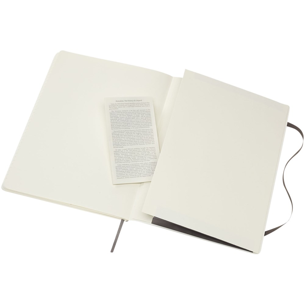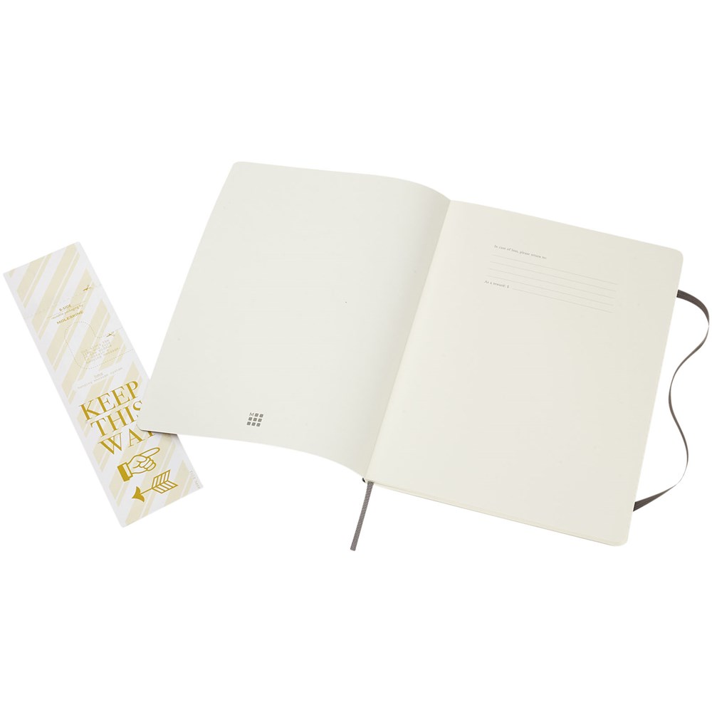 Het Moleskine Classic XL (19 x 25 cm) softcover notitieboek is verkrijgbaar in diverse stijlvolle, levendige kleuren. Het notitieboek heeft een kartonnen zachte omslag met afgeronde hoeken, zuurvrij papier, een bladwijzer en een elastische sluiting. De eerste pagina biedt ruimte voor persoonsgegevens en het noteren van een beloning die de eerlijke vinder ‘in geval van verlies’ ontvangt. Aan de achteromslag bevindt zich aan uitbreidbaar binnenvak met daarin de geschiedenis van Moleskine. Dit vak kan worden gebruikt voor losse papieren en notities. Bevat 192 ivoorkleurige gelinieerde pagina's. Deze versie is ook verkrijgbaar met stippen, ruitjes en in effen.