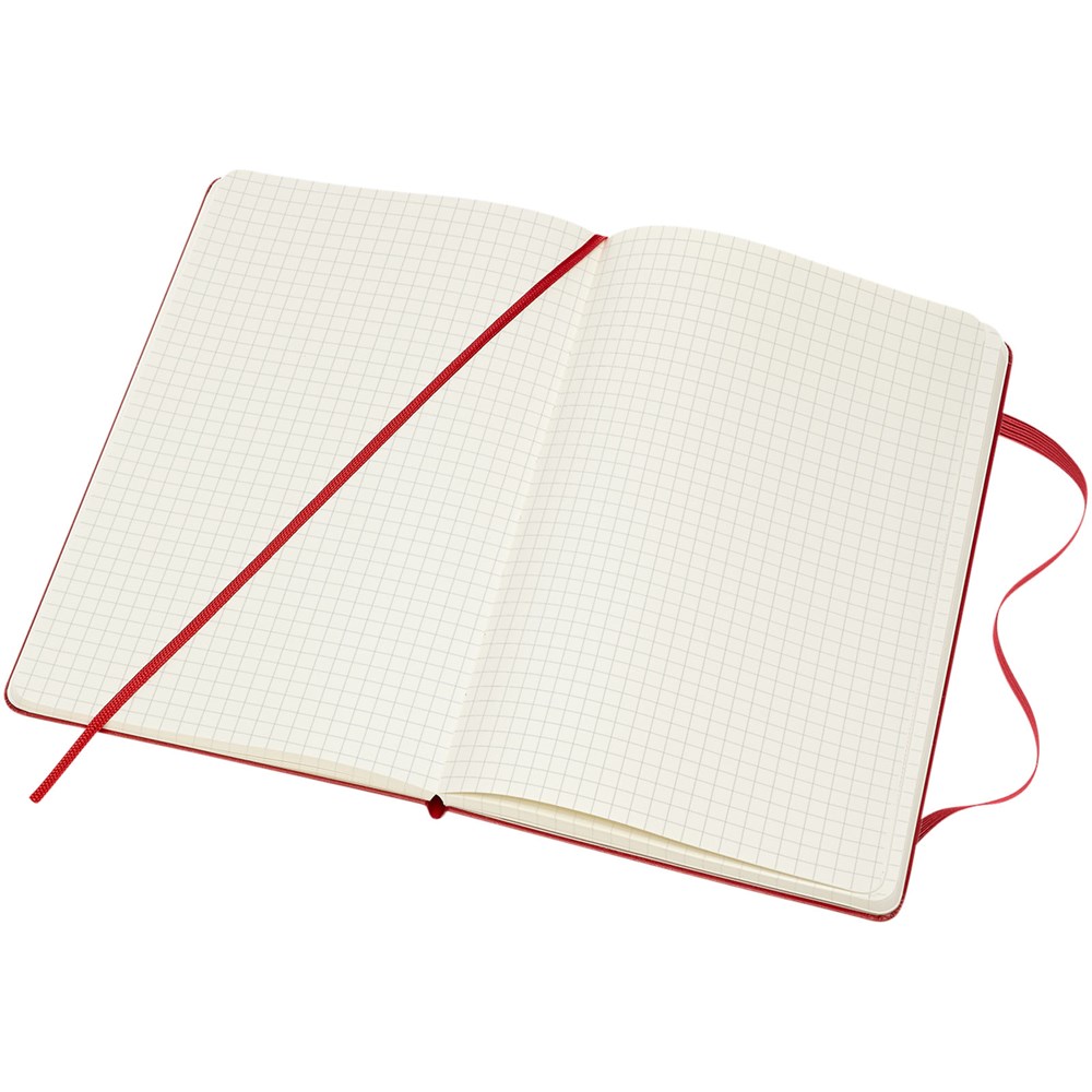Classic Moleskine groot notitieboek met harde omslag in de populaire kleur zwart, plus een variatie aan stijlvolle levendige kleuren. Met afgeronde hoeken, elastische sluiting en een bladwijzer. Uitbreidbaar kartonnen vak en doek aan de binnenkant van de achterste omslag. Bevat 240 ivoorkleurige pagina's met ruitjes. Pagina's zijn ook verkrijgbaar met ruitjes, stippen en in effen.