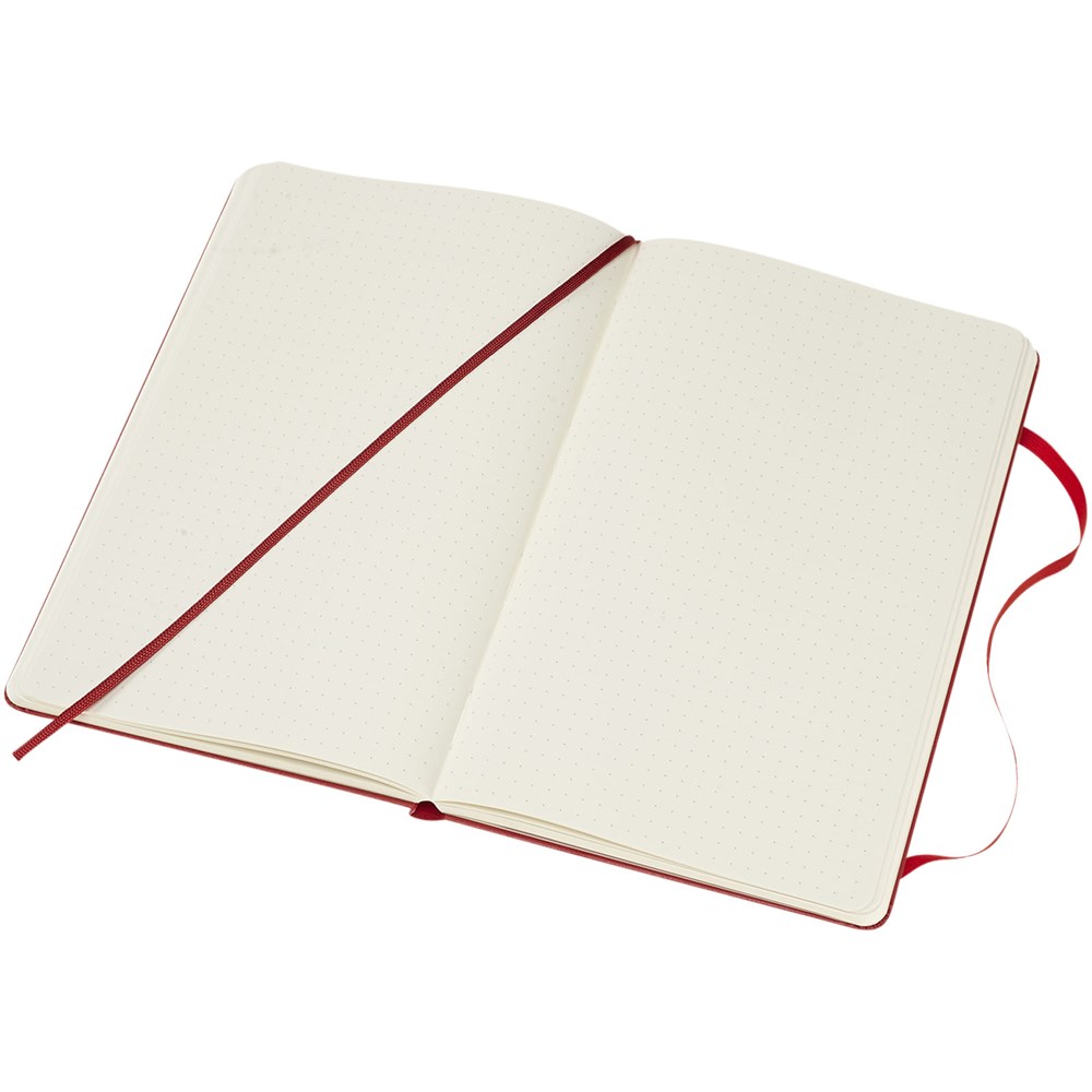 Classic Moleskine groot notitieboek met harde omslag in de populaire kleur zwart, plus een variatie aan stijlvolle levendige kleuren. Met afgeronde hoeken, elastische sluiting en een bladwijzer. Uitbreidbaar kartonnen vak en doek aan de binnenkant van de achterste omslag. Bevat 240 ivoorkleurige gestippelde pagina's. Pagina’s zijn ook verkrijgbaar met lijntjes, ruiten en effen papier.
