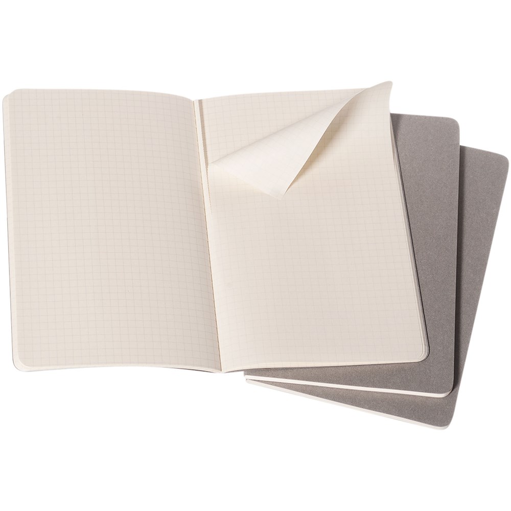 Bevat een kartonnen omslag met afgeronde hoeken. Zichtbare stiksels op de rug, met een flap voor losse notities. Bevat 80 70 gsm ivoorkleurige pagina's met ruitjes. De laatste 16 vellen zijn uitscheurbaar. Pagina's zijn ook verkrijgbaar met ruitjes, stippen en in effen.