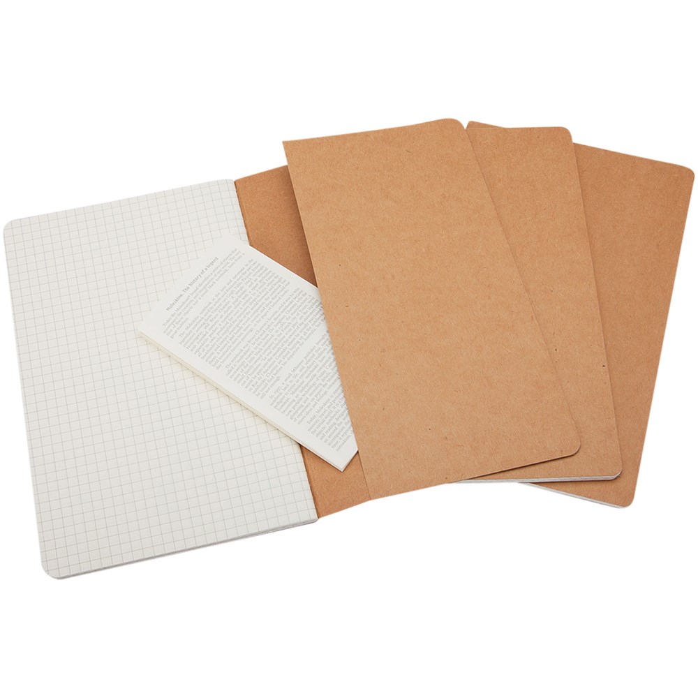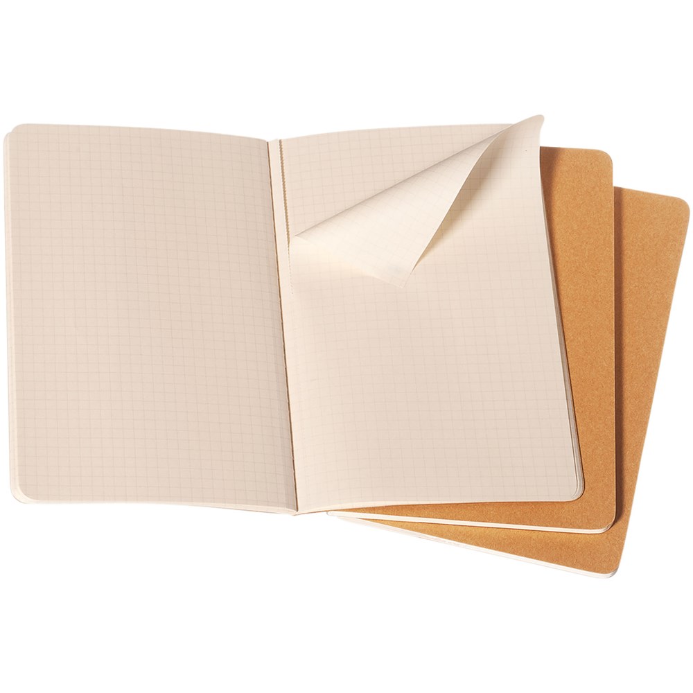 Bevat een kartonnen omslag met afgeronde hoeken. Zichtbare stiksels op de rug, met een flap voor losse notities. Bevat 80 70 gsm ivoorkleurige pagina's met ruitjes. De laatste 16 vellen zijn uitscheurbaar. Pagina's zijn ook verkrijgbaar met ruitjes, stippen en in effen.