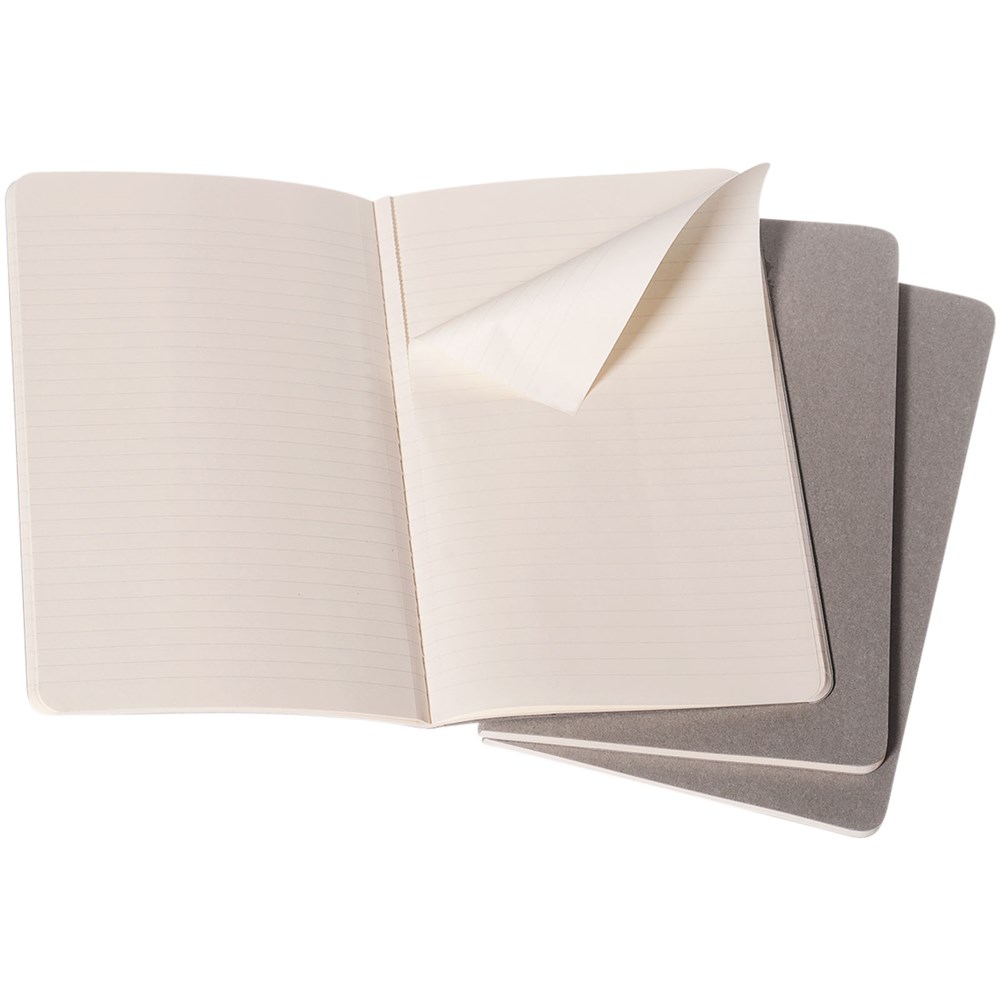 Bevat een kartonnen omslag met afgeronde hoeken. Zichtbare stiksels op de rug, met een flap voor losse notities. Bevat 64 70 gsm ivoorkleurige effen pagina's. De laatste 16 vellen zijn uitscheurbaar. Pagina's zijn ook verkrijgbaar met lijntjes, stippen en ruitjes.