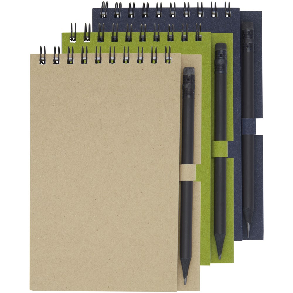 Gerecycled wire-O notitieboek met papieren kaft met 40 vellen, 80 g/m² blanco FSC gerecycled papier, en een zwart potlood. Het notitieboekje is gemaakt in Italië.