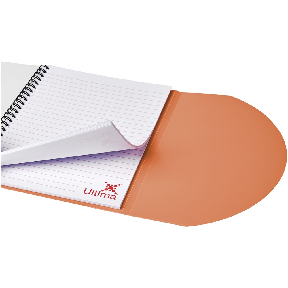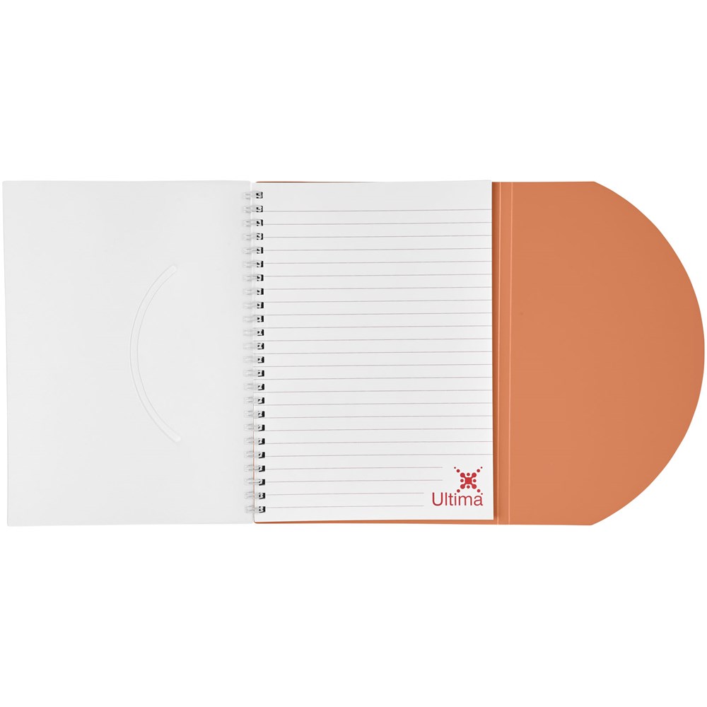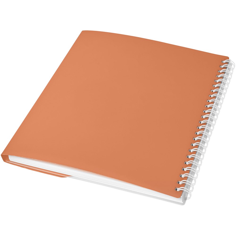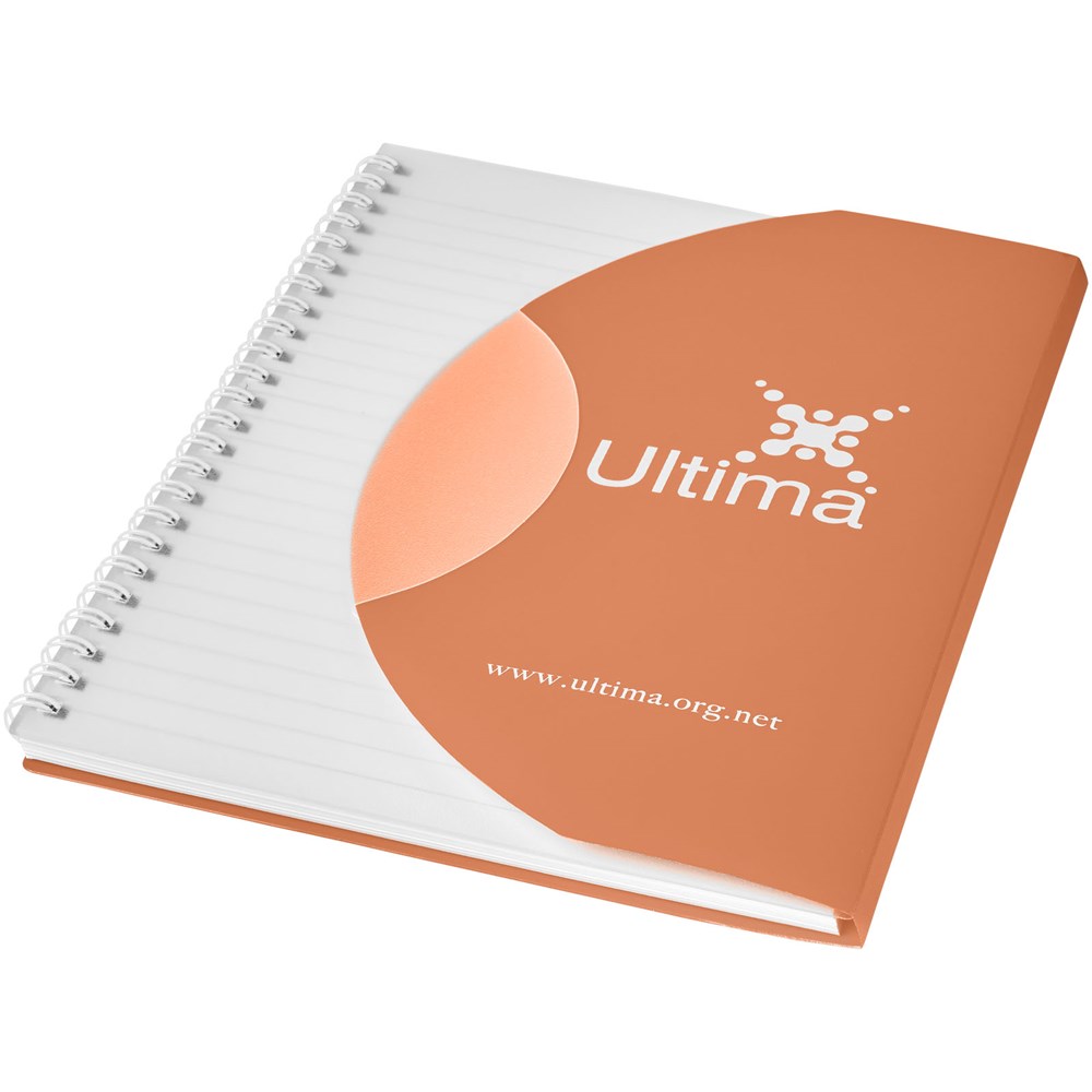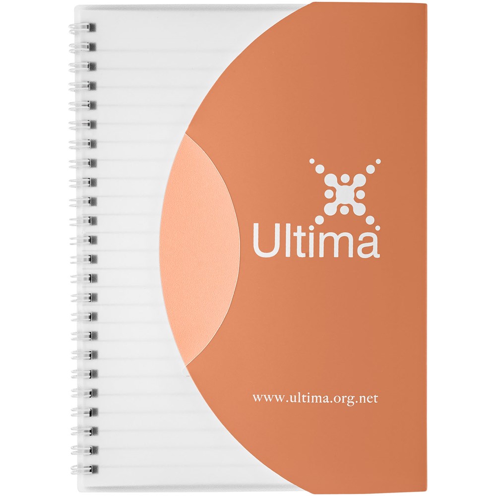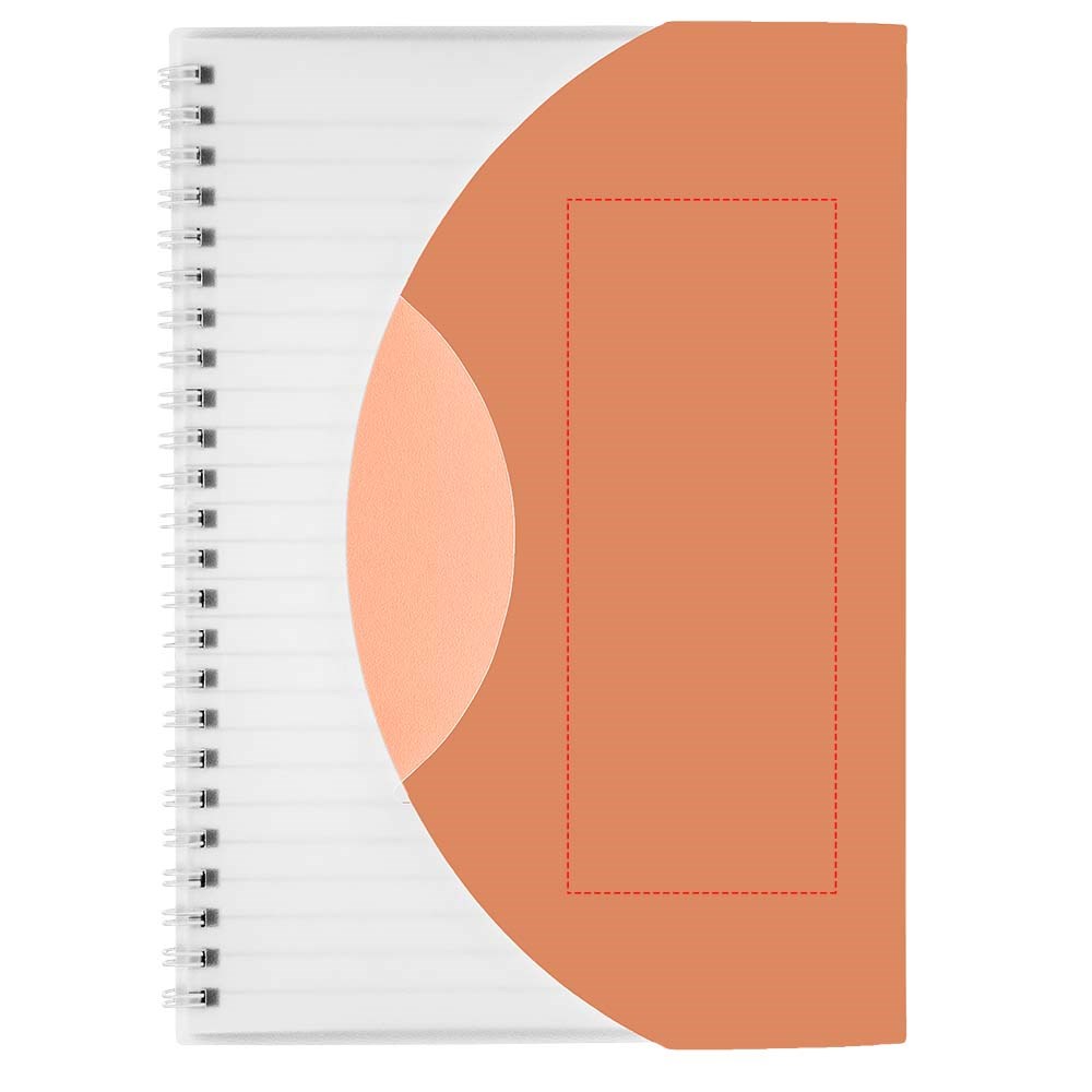 Bevat 50 bladen (80g/m2) blanco papier. Bevat een 500 micron omslag van gekleurd polypropyleen met een afgeronde vorm. Decoratie is mogelijk op de omslag, binnenin de omslag en op elk blad. Notitieboek is verkrijgbaar in verschillende kleuren.