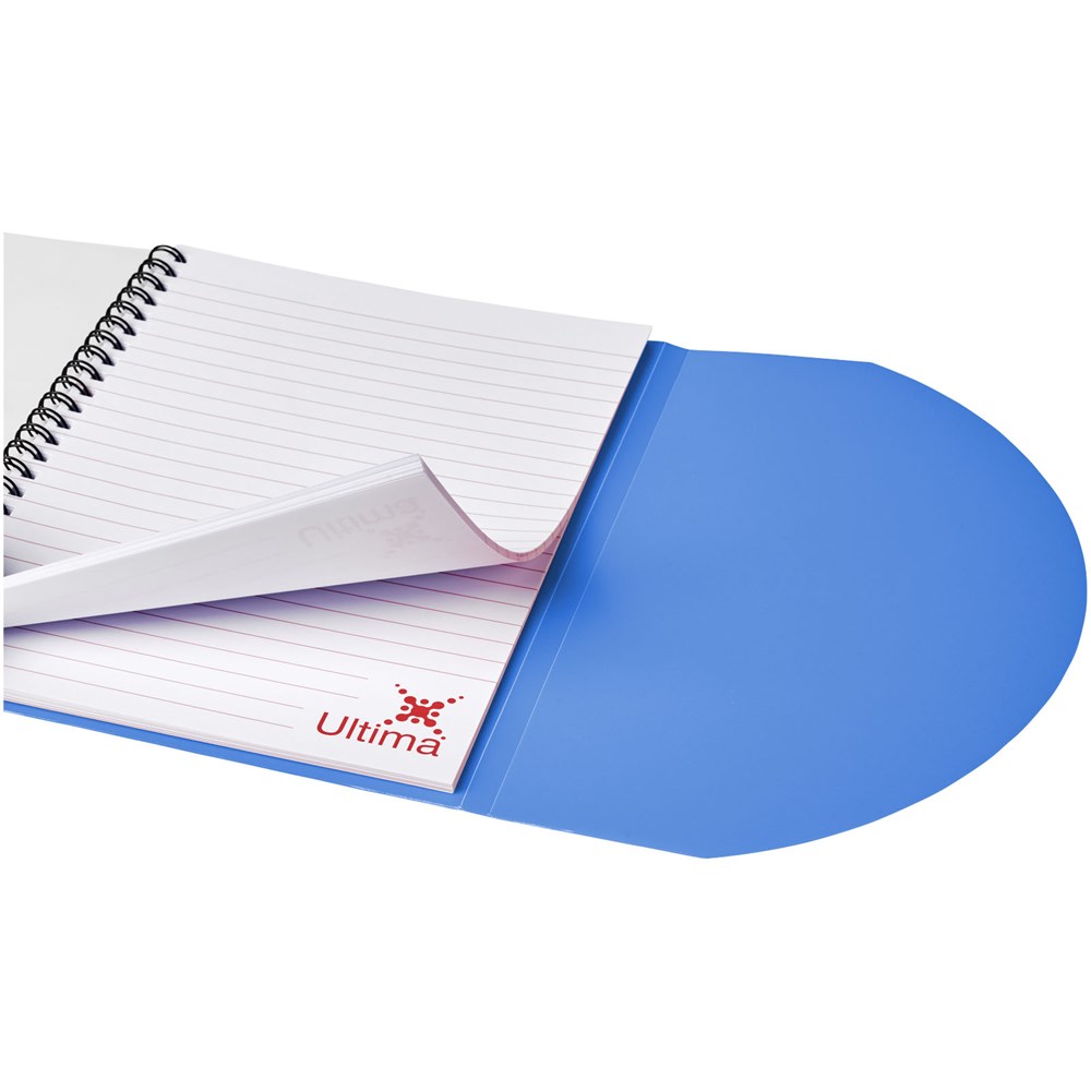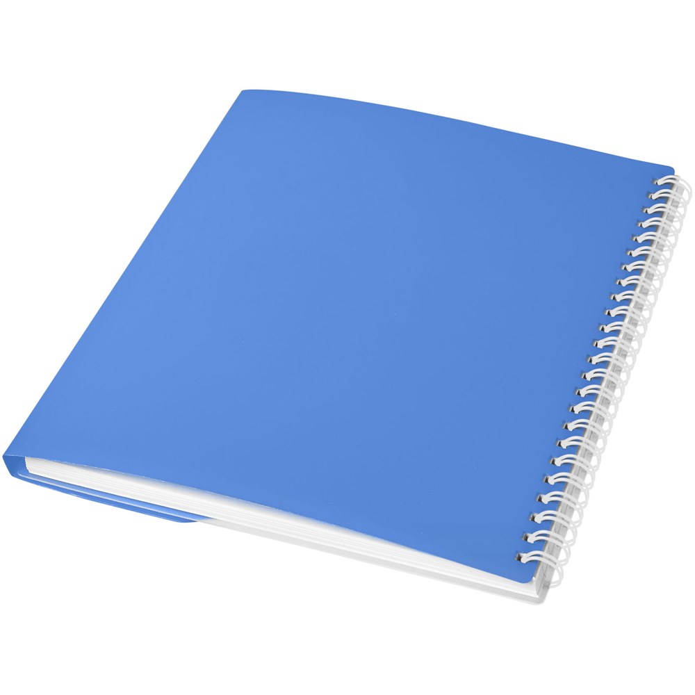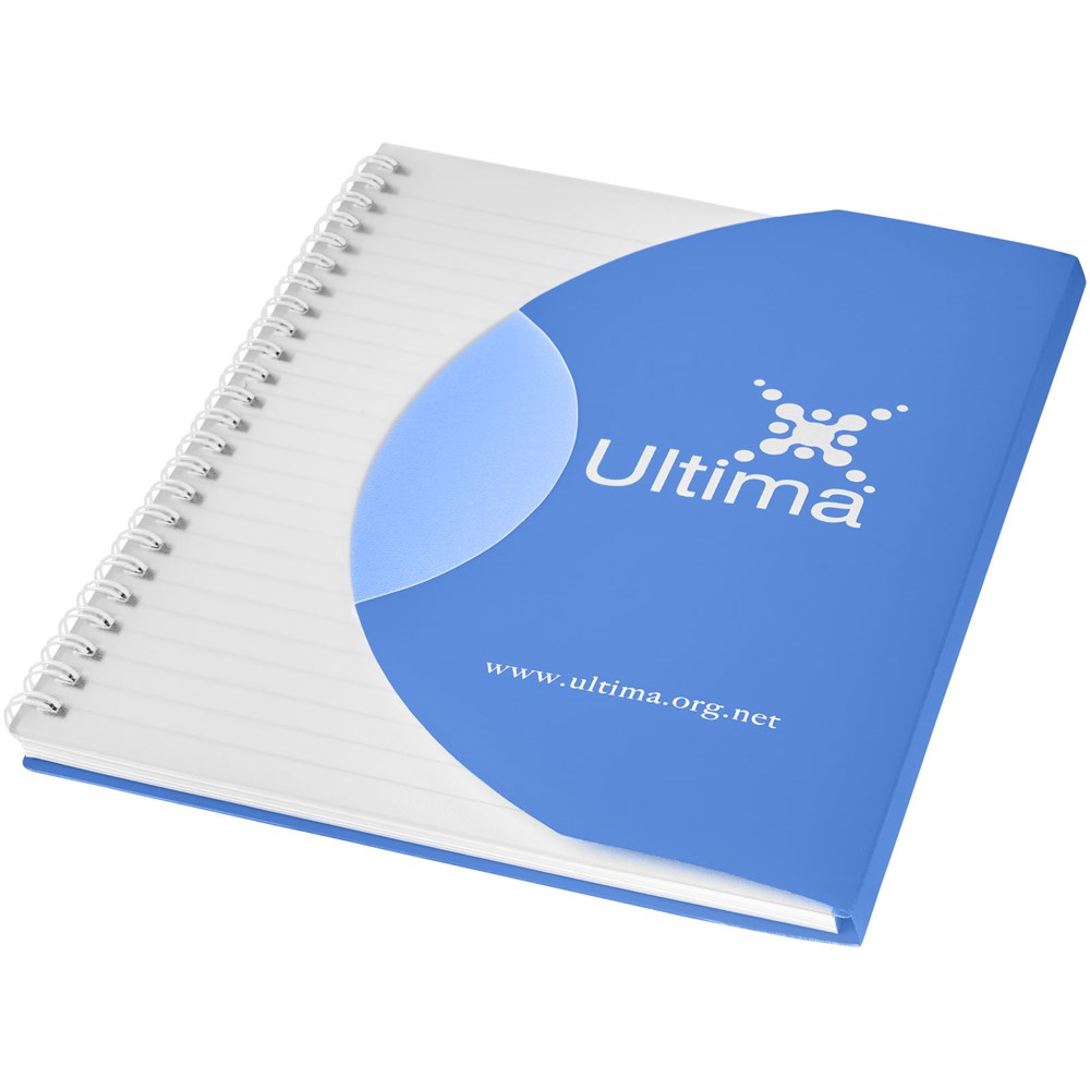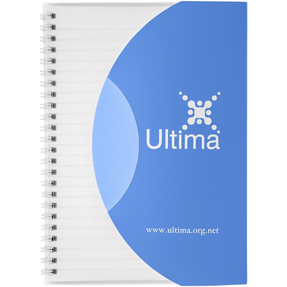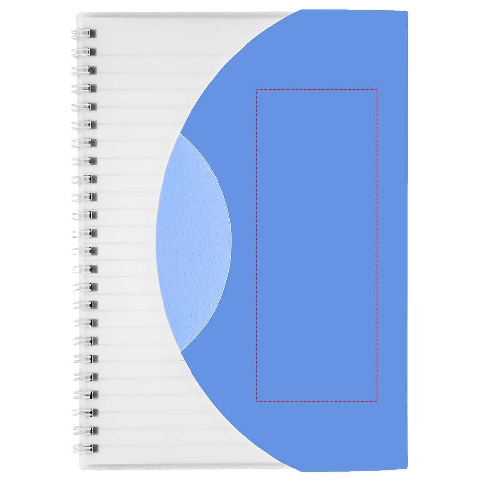 Bevat 50 bladen (80g/m2) blanco papier. Bevat een 500 micron omslag van gekleurd polypropyleen met een afgeronde vorm. Decoratie is mogelijk op de omslag, binnenin de omslag en op elk blad. Notitieboek is verkrijgbaar in verschillende kleuren.